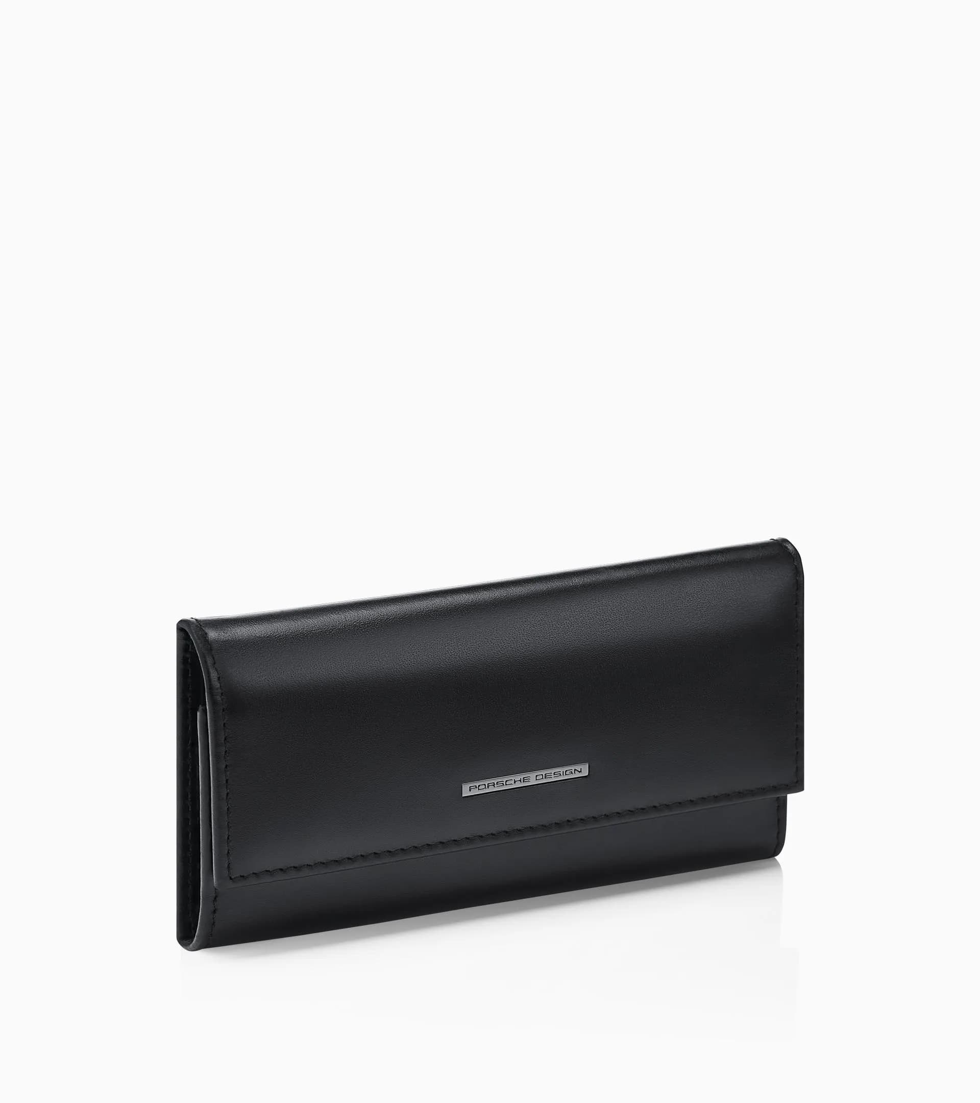 Large, folding key case with a popper closure. Smooth calf leather with the embossed Porsche Design logo and karabiner clips for six keys.