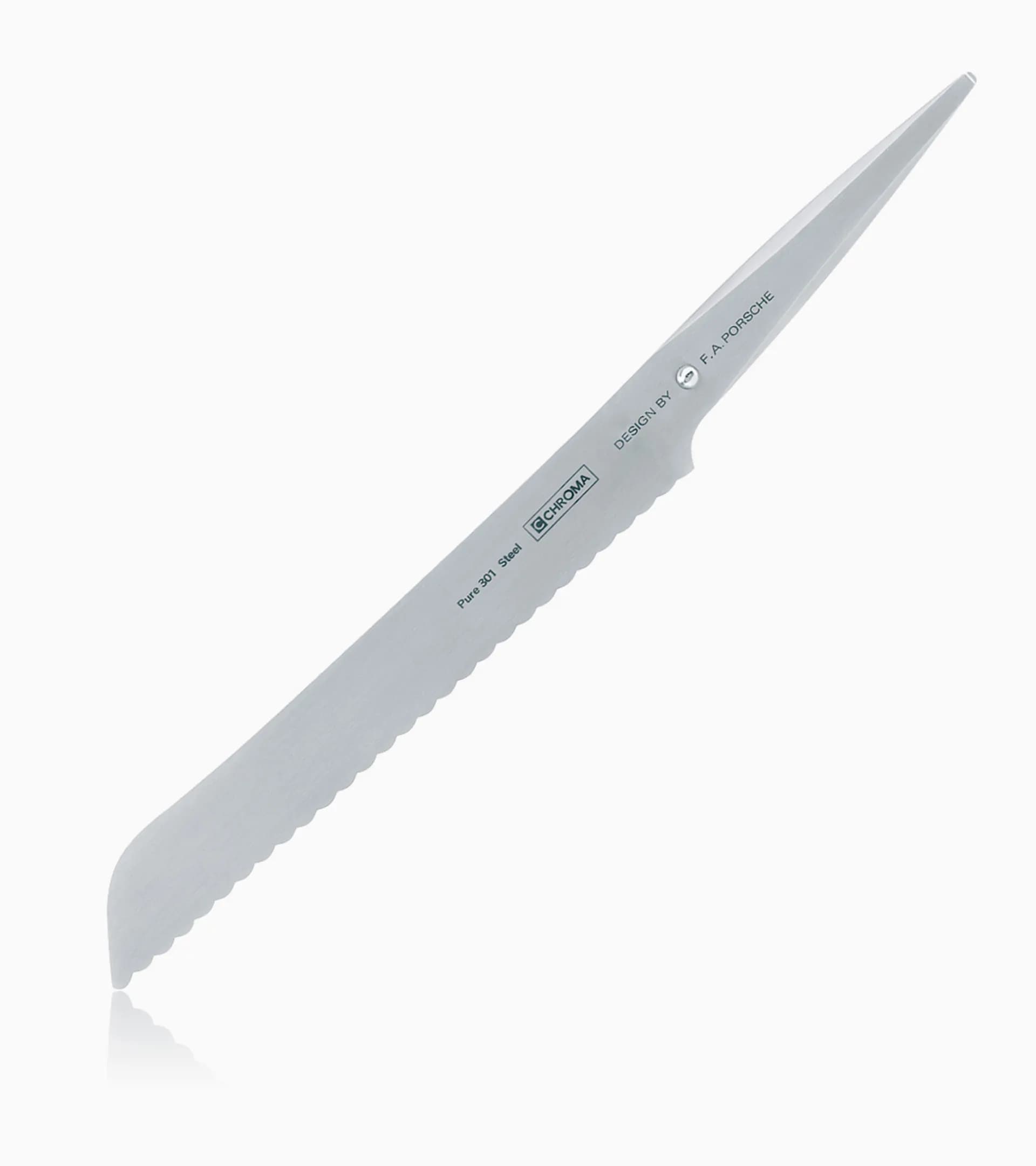 This Porsche Design bread knife is more than just a utensil – it is a statement of excellent design and professional craftsmanship in your kitchen. Specially developed for slicing all types of bread as well as hard-shelled fruits and vegetables, such as pineapple or pumpkin, the knife impresses with its excellent cutting quality and outstanding ergonomics.The handle and blade merge seamlessly into one another, ensuring balanced and effortless handling. Only the distinctive stainless steel bead subtly marks the transition between the blade and handle, while also serving as an ideal resting place for your thumb and index finger. The ergonomically designed handle is deliberately based on the working methods of professional chefs who use their knives at variable cutting angles. Thanks to the special bevels on the handle, comfortable and flexible handling is possible without the need for a fixed grip.Made from high-quality Japanese Pure 301 steel, the blade guarantees durability and exceptional sharpness that meet even the highest demands. Design by Studio F. A. Porsche.