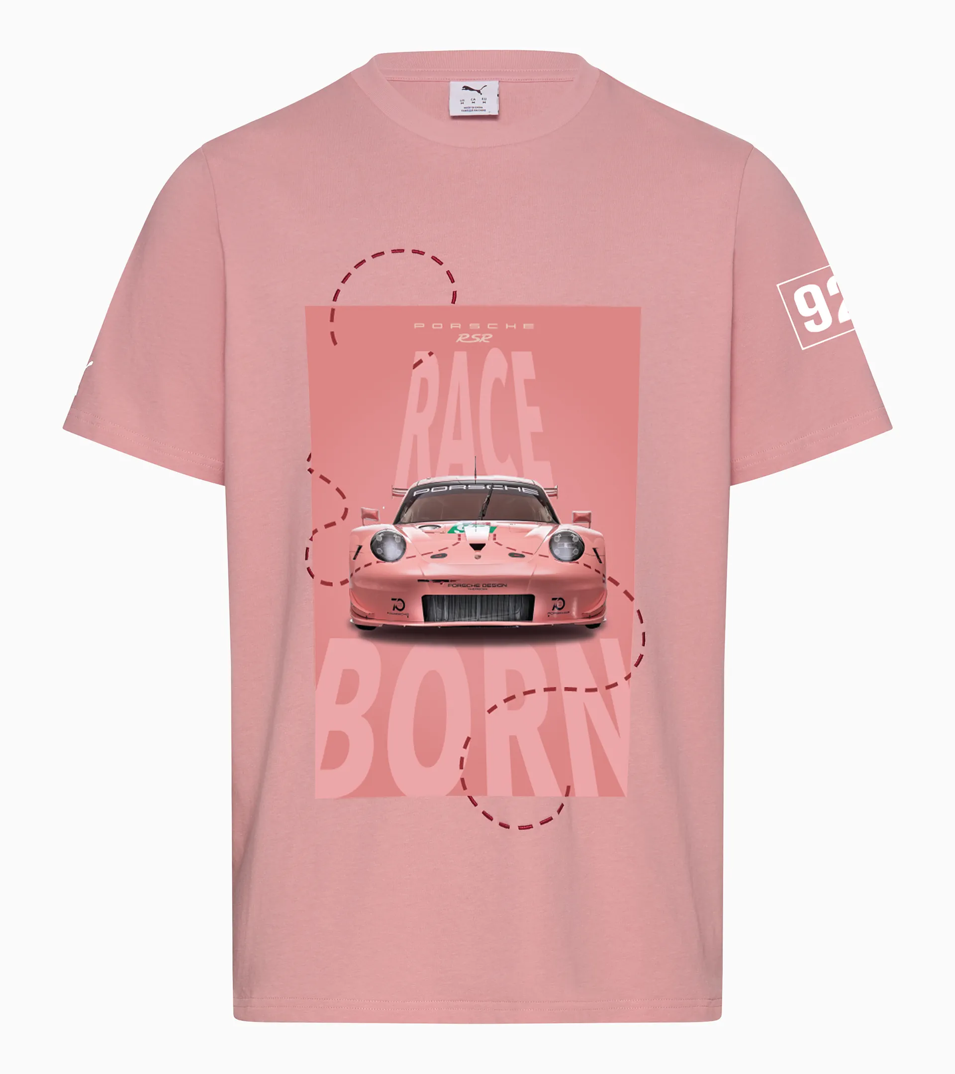 Racing tradition meets contemporary design. This graphic design T-shirt appeals to motorsport and streetwear enthusiasts alike, drawing inspiration from the legendary Porsche 911 RSR, which featured a re-interpretation of the Porsche 917 livery in 2018. The Porsche 917 first competed in the 24 Hours of Le Mans in 1971 with its iconic ‘Pink Pig’ livery.