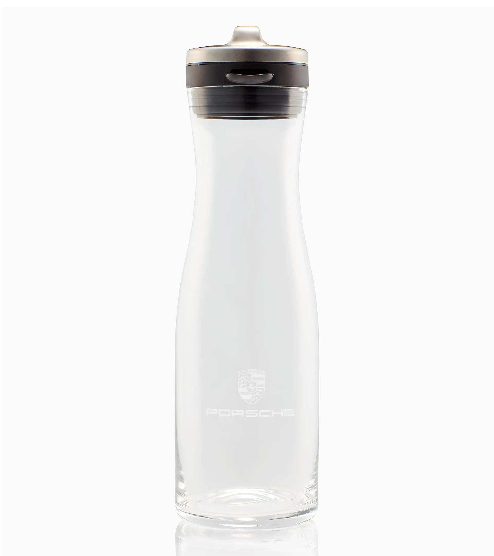 Carafe en verre avec écusson Porsche monochrome.