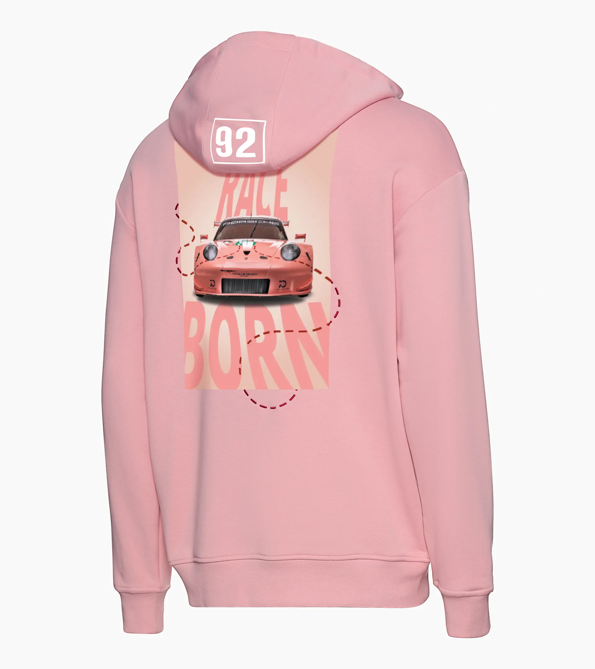 Tradition de la course automobile et design contemporain : inspirée de la légendaire Porsche 911 RSR, qui présentait en 2018 une réinterprétation de la livrée de la Porsche 917 prenant pour la première fois le départ des 24 Heures du Mans 1971 avec la légendaire livrée « Pink Pig », ce sweat à capuche graphique ravira les amateurs de sport automobile et de streetwear.