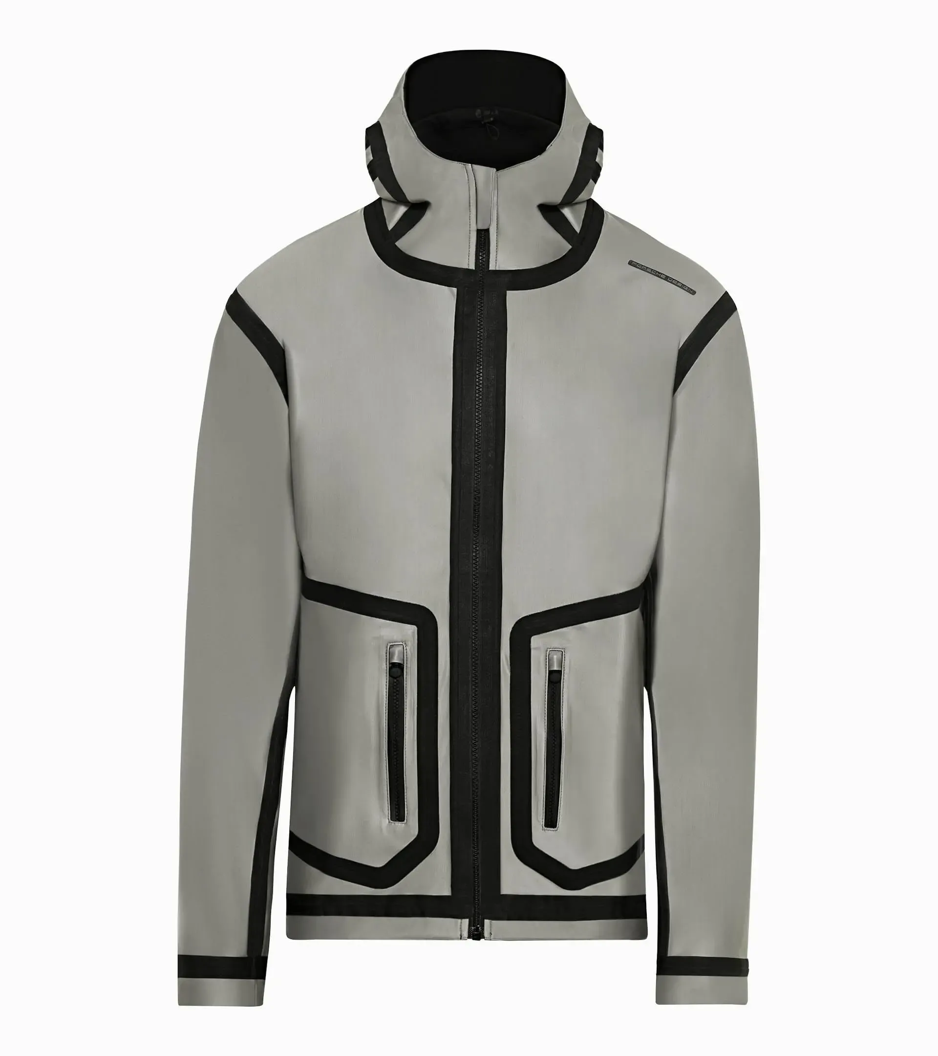 50 years of engineered passion: since 1972, Porsche Design has been writing design history with products that perfectly combine technology, passion, and performance. The limited 50Y Porsche Design Capsule Collection is an homage to this unmistakable design DNA. Take, for example, the 50Y Reversible Jacket. The very lightweight reversible jacket is not only hugely flexible in terms of its style thanks to its two differently colored sides, it is also multifunctional. Breathable, windproof, waterproof, elasticated, durable, temperature-regulating: the high-tech outer fabric developed exclusively for Porsche Design – a three-layer, extremely lightweight, and stable laminate – makes the jacket spectacularly versatile. Worn with the matt black side to the outside, the material is warming. But with the titanium-colored, sun-reflecting side to the outside, it is cooling. In combination with the clean, technical design, a jacket is created that you can wear all year round and for all leisure activities – whether hiking, travelling, skiing, or simply for a city trip. For optimal protection against wind and weather, the material (water column 10,000) is supported by an adjustable hood, aqua-stop zippers, and hot-sealed seams. Discreet branding such as the 50Y Porsche Design logo completes the exclusive style. For the perfect 50Y sportswear look, combine the statement jacket with the 50Y Tee, Cargo Pants, 50Y Cap, and the new 50Y RCT PWRPlate Sneakers.