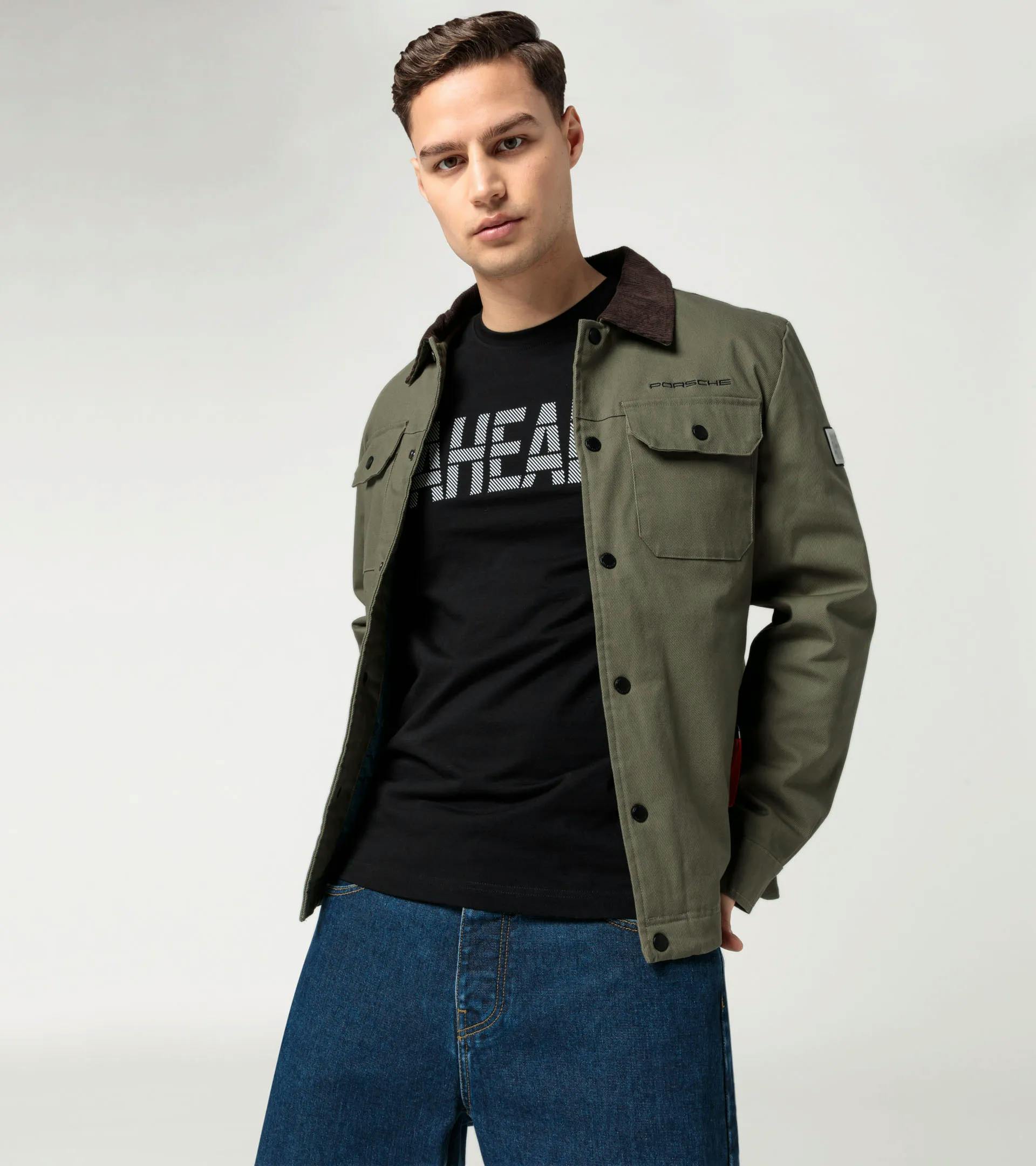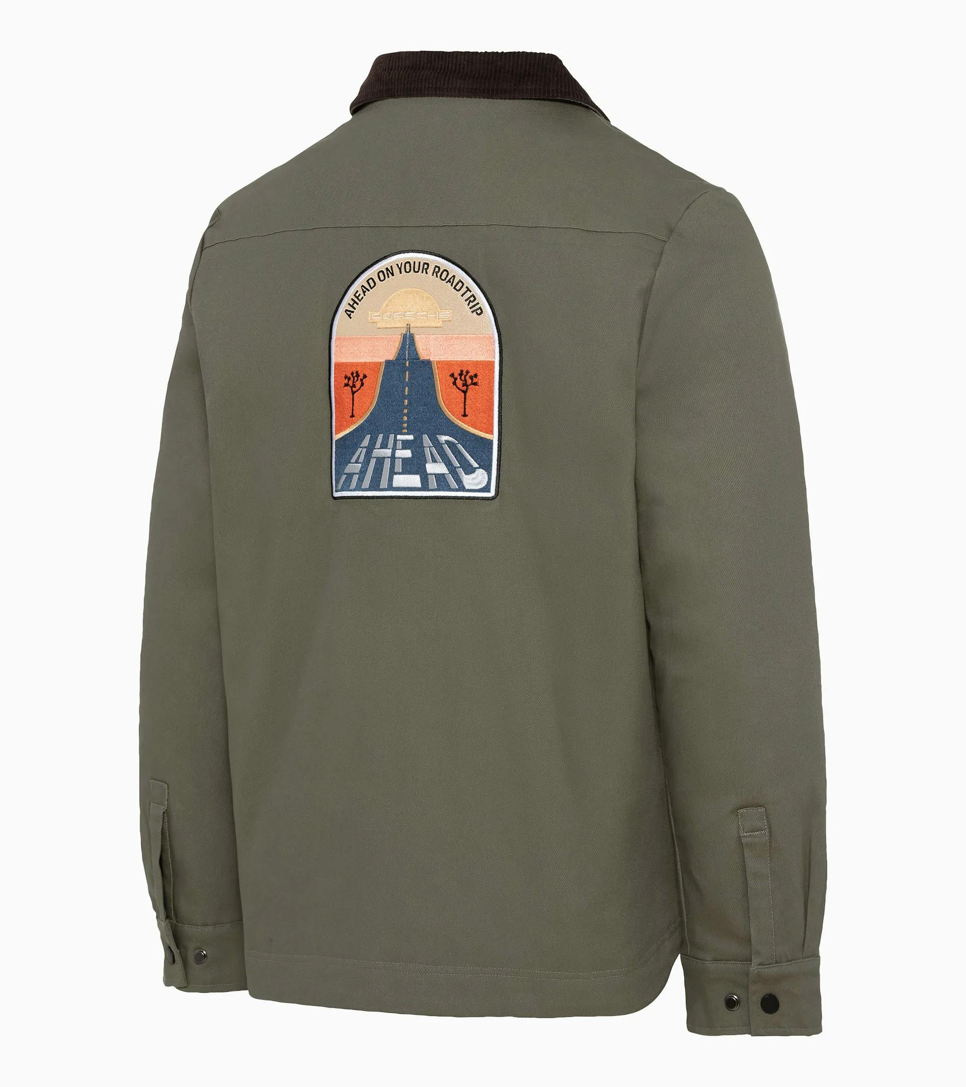 Road trip meets lifestyle: the AHEAD Collection combines pioneering spirit and a thirst for adventure with iconic design. The jacket made of high-quality cotton promises both comfort and durability. A highlight is its comfortable corduroy collar. The patch pockets at chest height with snap fasteners and the embroidered Porsche lettering above the left side of the chest underline the attention to detail of the design. The front can be closed with branded buttons. Two side pockets at hip height ensure functionality and can be securely closed with zips. A large AHEAD badge on the back makes the jacket a real eye-catcher. Size-adjustable sleeve hems with two buttons fit seamlessly into the sporty look. An additional inner zip pocket offers practical storage space for essentials. As an added extra, a removable key ring with the word 'AHEAD' is attached to the side pockets.