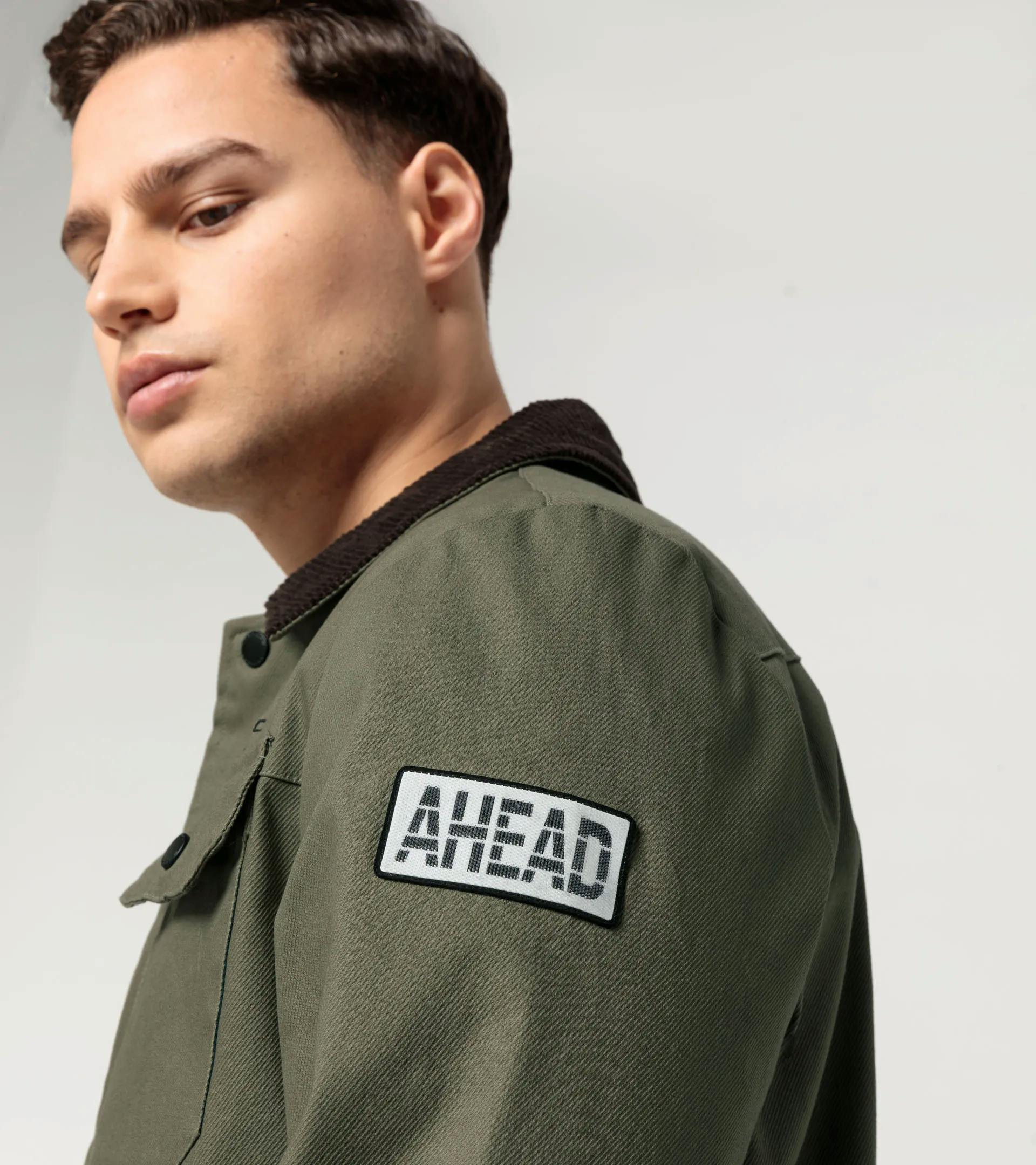 Cosy jacket with corduroy collar and distinctive AHEAD badge on the back.