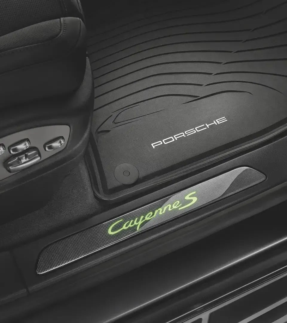 Four-piece set in attractive design with vehicle silhouette and "PORSCHE" logo. Non-slip and impermeable to water. With raised surrounding border.