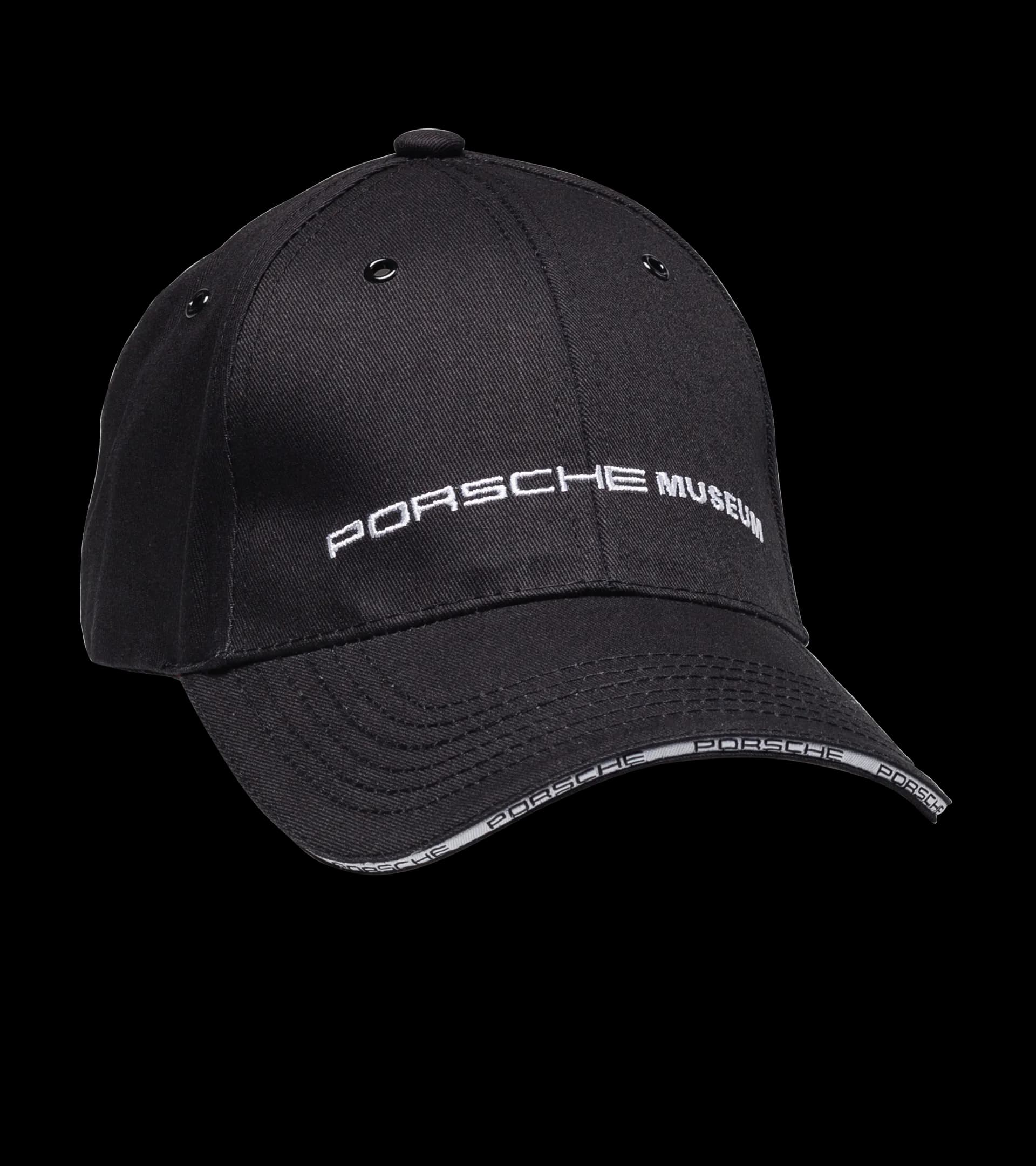 Classic black visor cap with white PORSCHE Museum lettering on the front and closure. The cap has ventilation holes on the head.