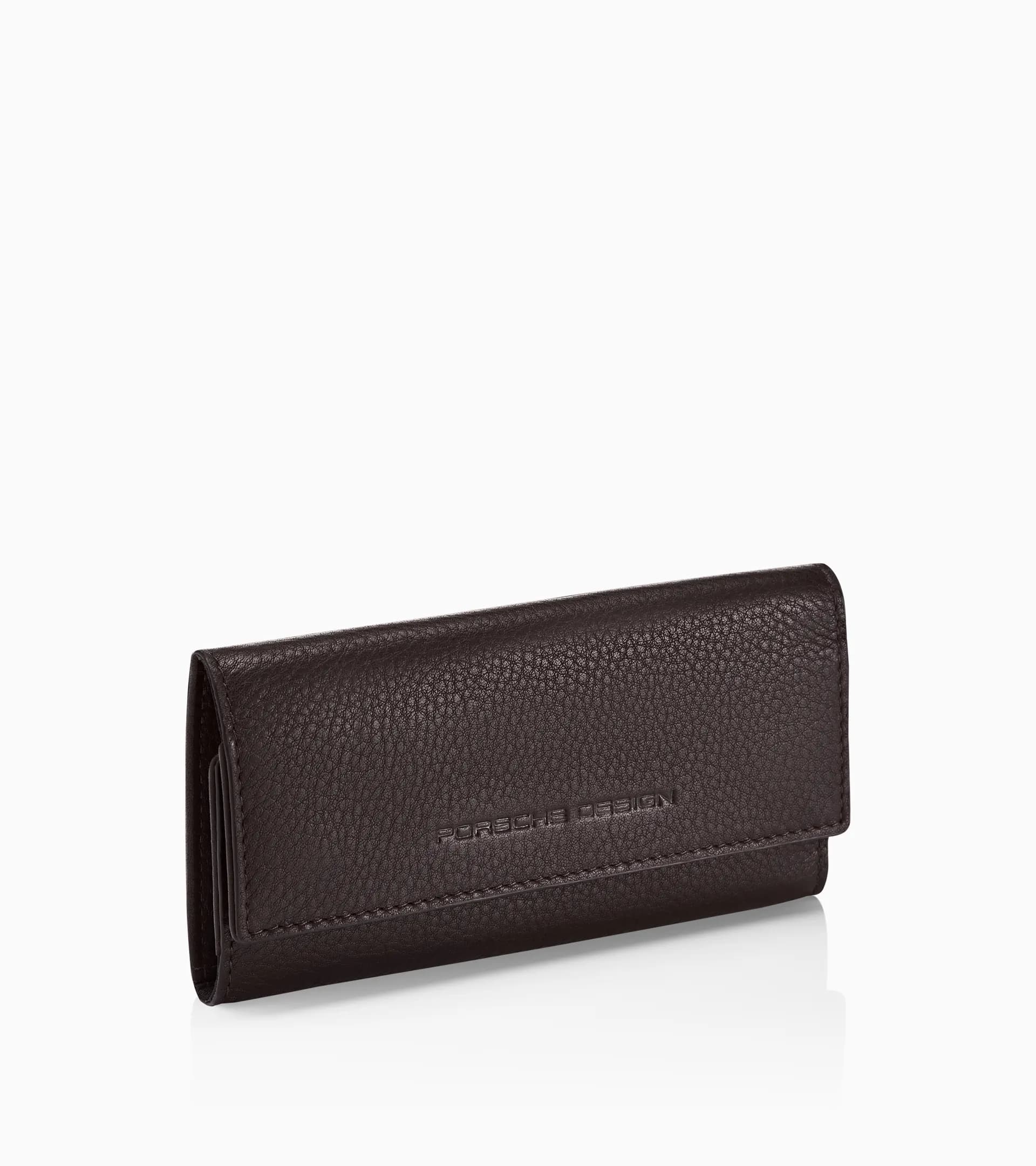 Large, folding key case with a popper closure. Soft, grained leather with the embossed Porsche Design logo and karabiner clips for six keys.