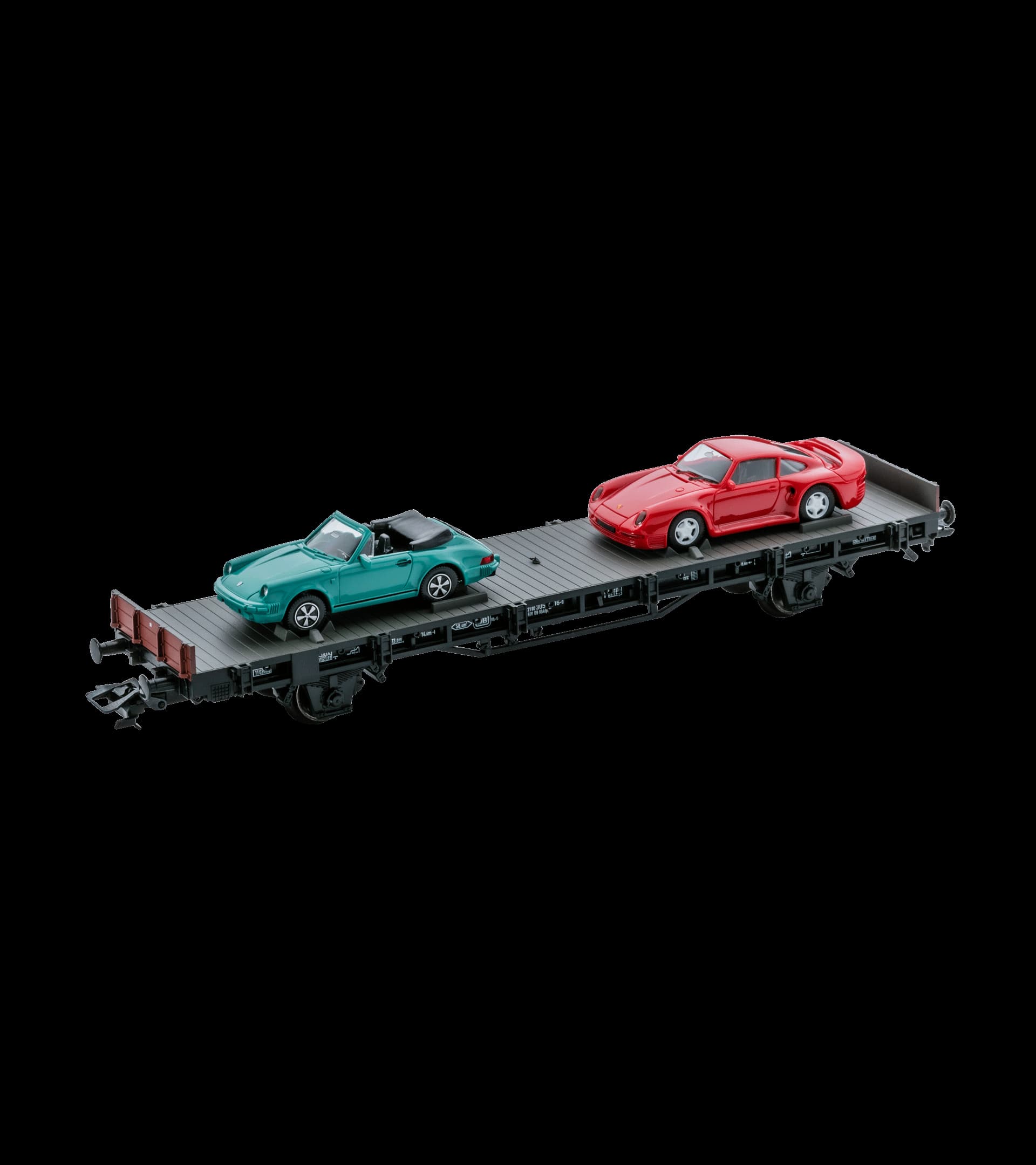 The flat wagon is loaded with 1 911 SC Cabriolet and 1 Porsche 959. Operating condition around 1986. Flat wagon with long wheelbase. Flat wagon body with retaining fixtures for motor vehicles. Loaded with 1 Porsche model from Wiking and 1 Porsche model from Herpa. Length over buffers 15.5 cm. DC wheel set E700580.