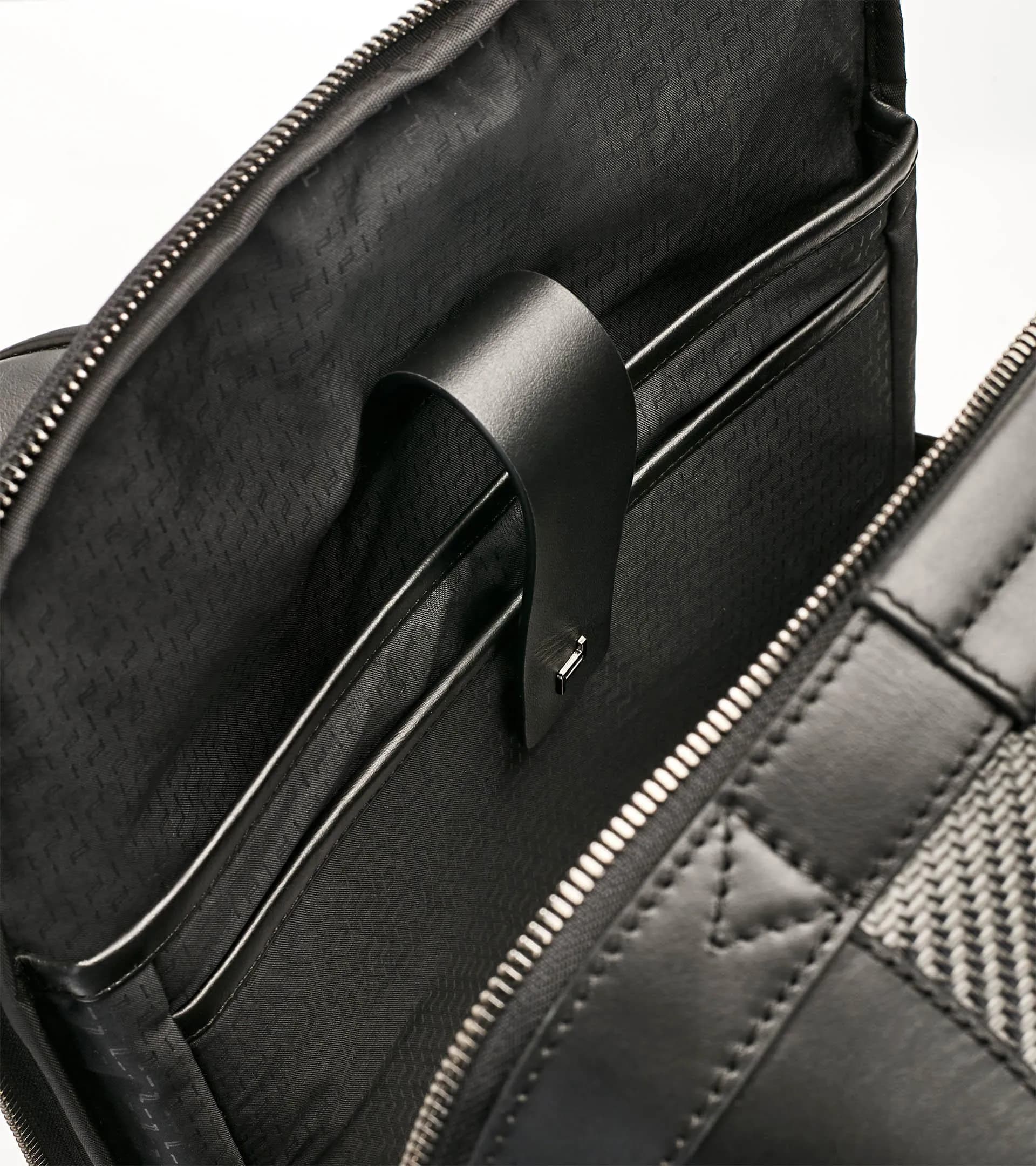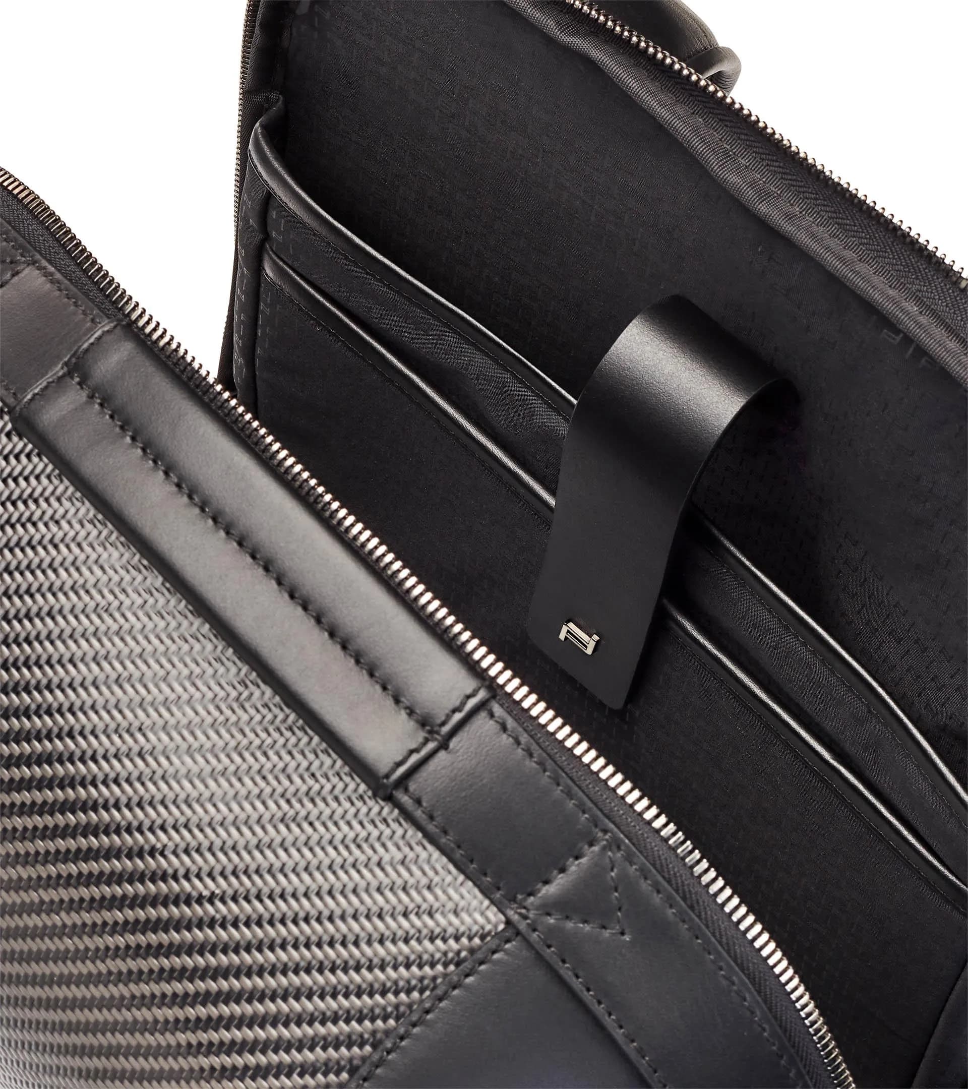 Fascination Carbon. The high-tech material from motorsport gives the Porsche Design Carbon Backpack - like all models in the Porsche Design Carbon Collection - its unmistakable design DNA. Lightweight, textured carbon fiber fabric and the finest box calf leather, combined in an iconic, minimalist design, make this backpack an exclusive, timelessly stylish companion. The new model variant is characterized by optimum comfort and functionality. The improved design with backward offset zipper makes access to the large main compartment with 13'' notebook compartment even easier. The integrated business organizer with key fob and compartments for mobile devices, card holder and cables provides perfect structure and quick accessibility. Also, the slide-in compartment on the front is now even more convenient to use, thanks to a magnetic closure. Comfortable, padded, adjustable shoulder straps, a padded back panel and a trolley link ensure that the high-tech backpack not only looks unique on trips and during leisure time, but is also just as comfortable to wear.