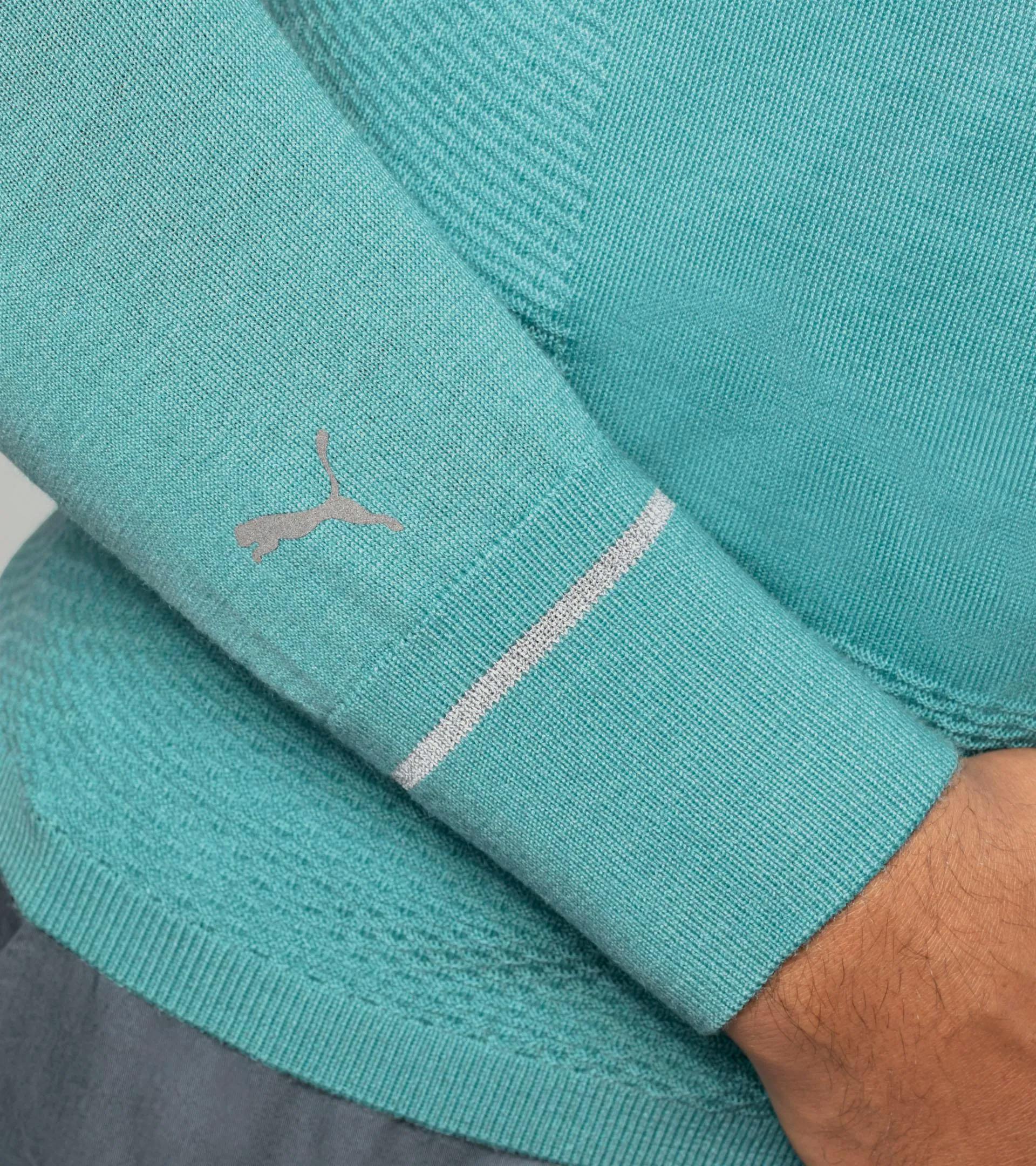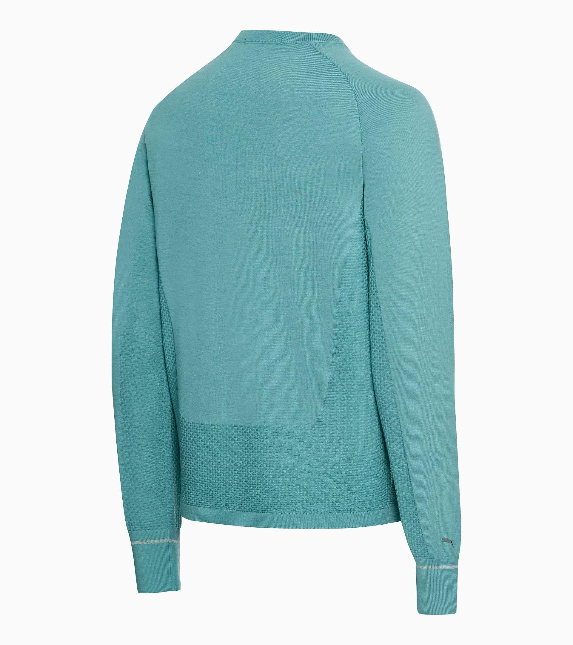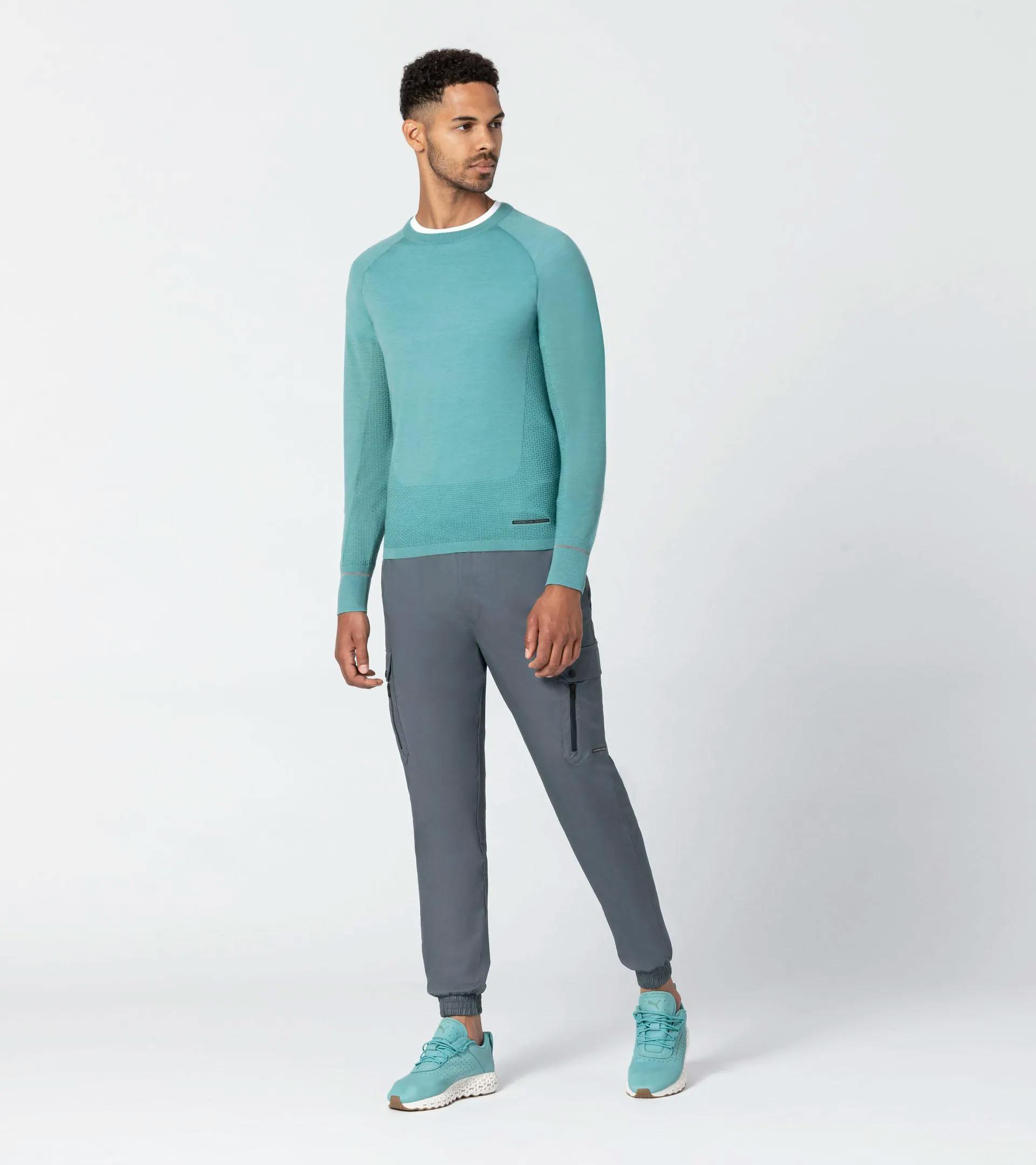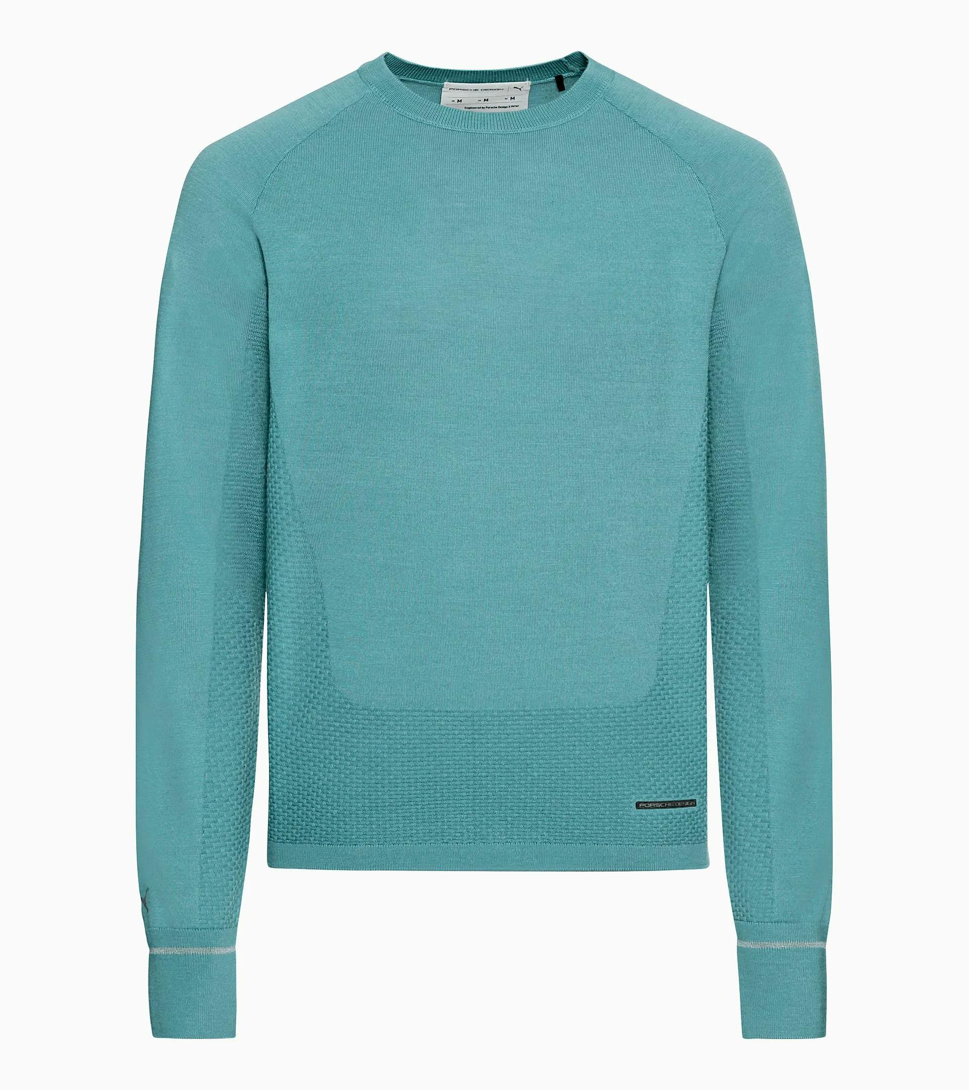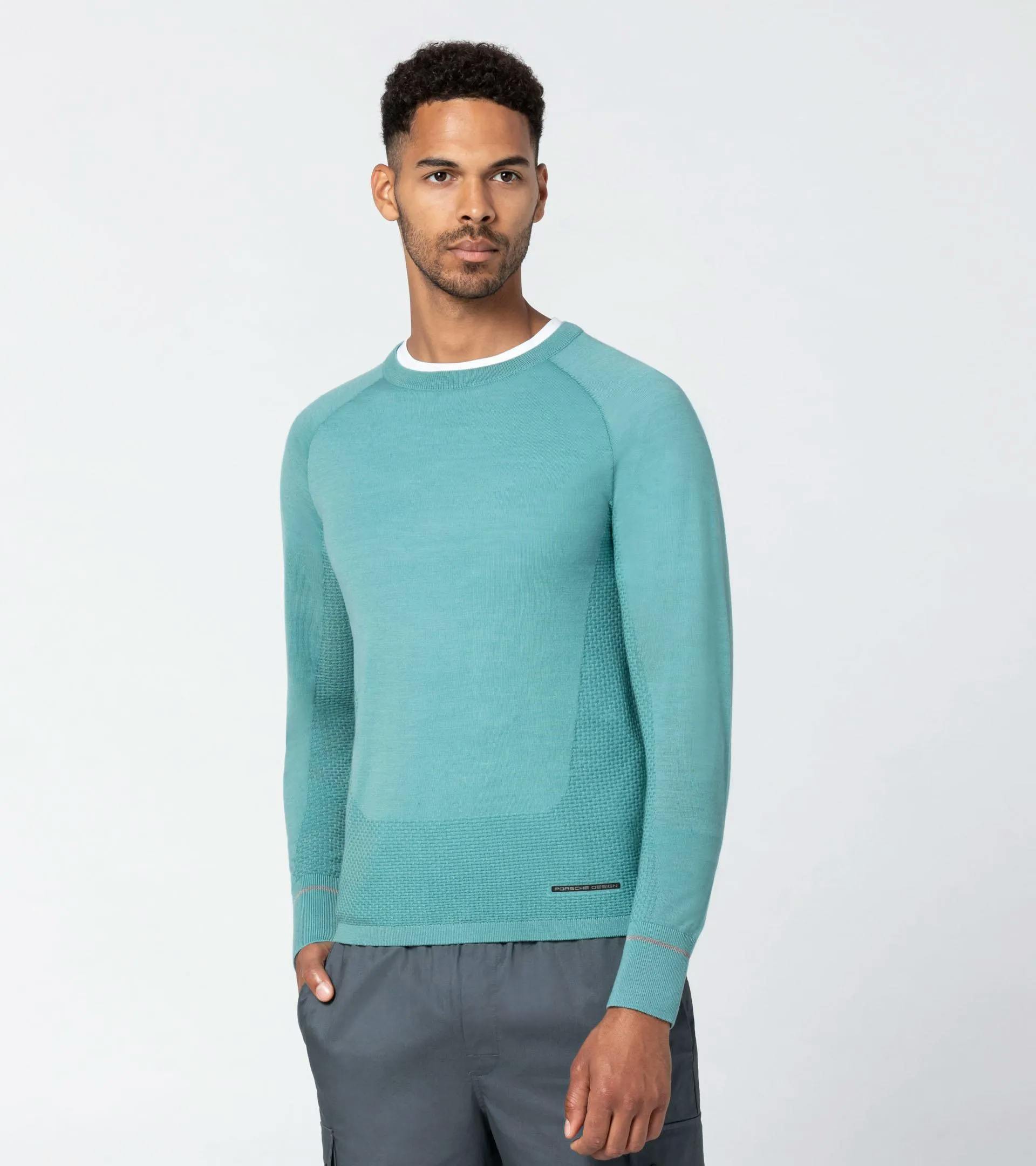 A technical upgrade of the classic sweater: the Porsche Design evoKNIT® Crew Neck in a high-performance knit takes the evergreen men's crew neck sweater to a new level. The new evoKNIT® technology combines warming Merino wool and breathable, moisture-wicking mesh ventilation areas almost seamlessly. Thus, in addition to maximum freedom of movement and a unique design aesthetic, the sweater also keeps you warm and pleasantly dry every day. The reflective yarn strips knitted into the cuffs, combined with the seamless design and dynamic lines, give it a unique and exclusive sporty character. If it’s a sweater you need, make it this one.