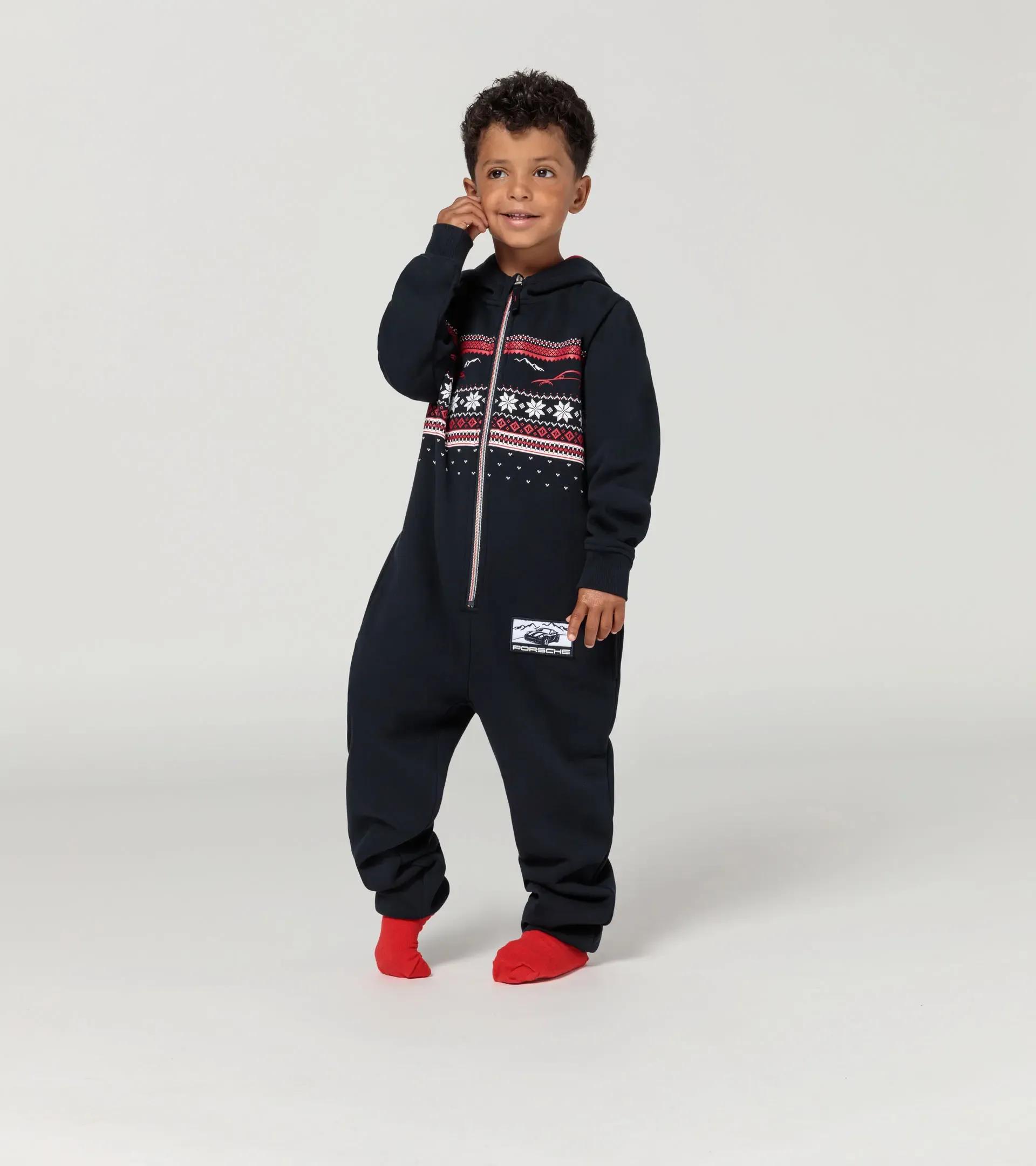 Cosy, warm Porsche jumpsuit for kids from the Essential Collection. With a high-quality Christmas print and a Porsche Christmas badge sewn on the front. The zip on the centre front makes it easy to slip on – cuffs on the hem and sleeves ensure a perfect fit. The attached hood with contrasting lining is a visual design detail.