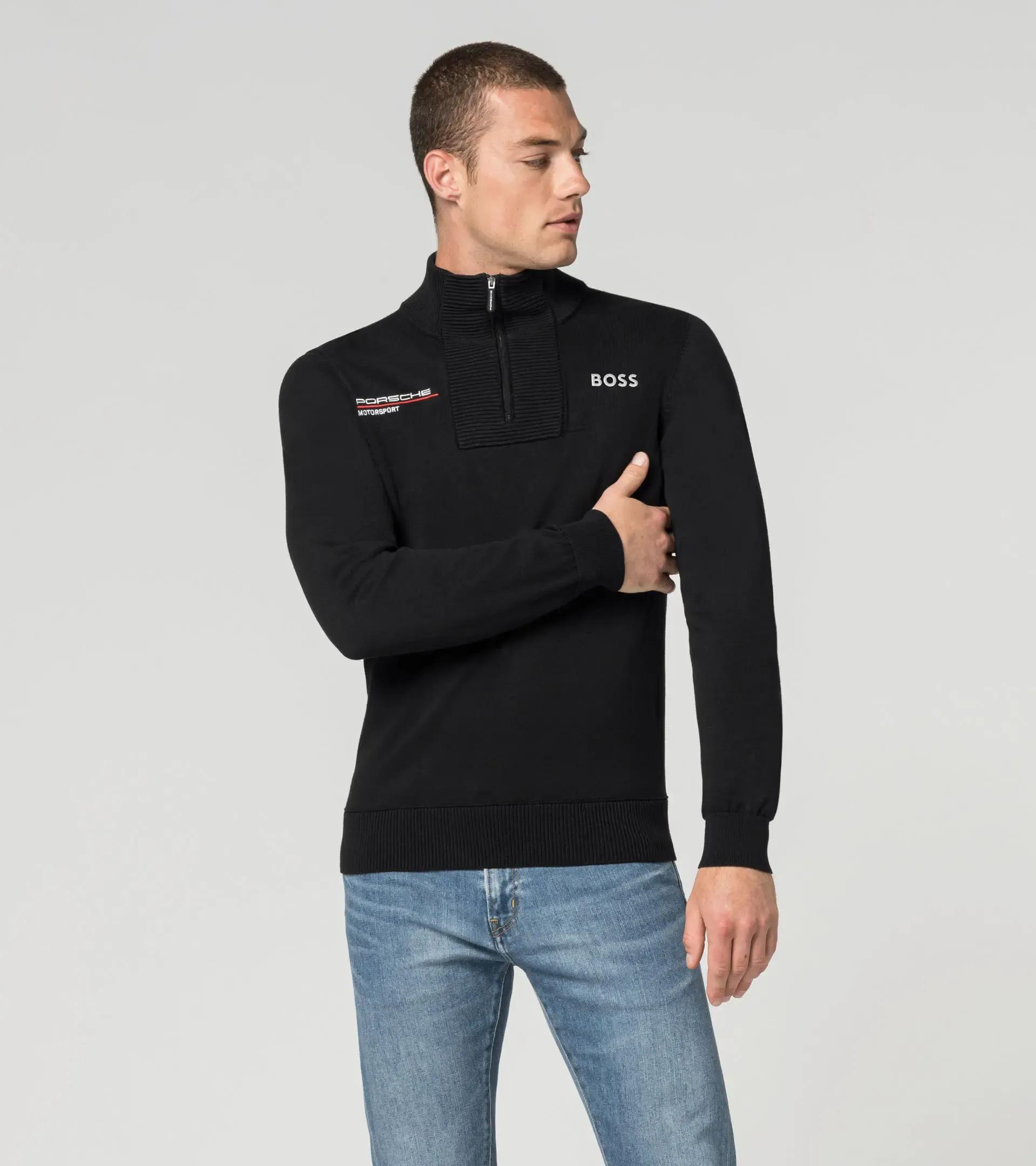 Troyer with stand-up collar and short zipper. Based on the original Porsche Motorsport Team clothing. Porsche Motorsport and Hugo Boss logo embroidered on chest. Michelin and Mobil1 logo embroidered on upper arm. Hugo Boss logo embroidered on back.