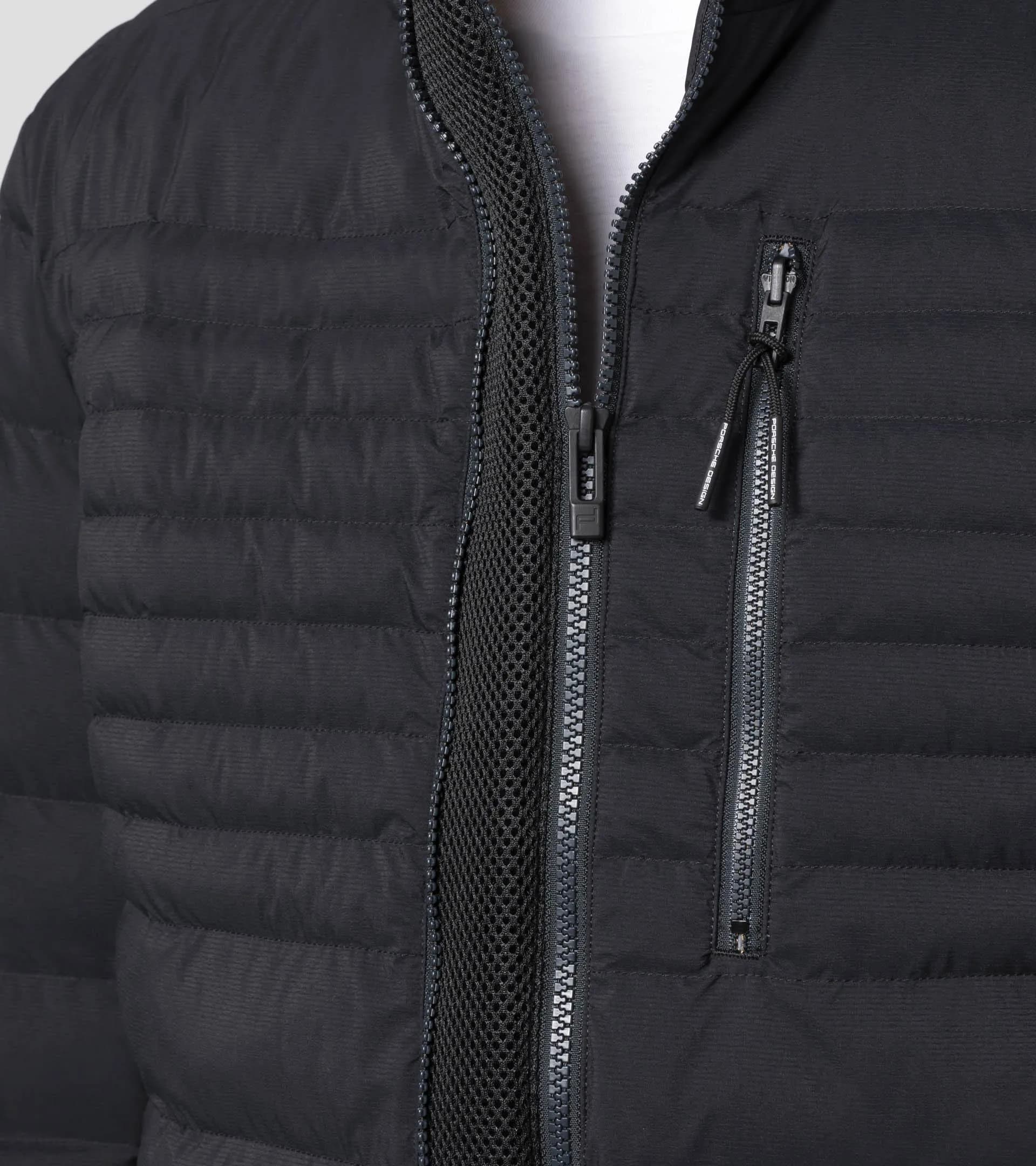Dynamism to go: the breathable, stowable Porsche Design Light Packable Jacket is a luxury head-turner with its quilting and characteristic lines. The quilted structure with chambers in different widths and jersey inserts with graphene under the arms gives the lightweight jacket a technical appearance with distinctive Porsche DNA and maximum comfort. The sustainable padding is also typical Porsche Design: REPREVE® eco fiber made from recycled polyester is one of the most certified, environmental friendly fibers in the world. The innovative zipper mechanism in the front, which is backed with a mesh insert and second zipper, allows you to adjust the fit of the jacket as needed. The highlight of the summer quilted jacket however lies in the detail: the jacket can be quickly packed into the inside chest pocket and transported compactly. Perfect for spontaneous plans and changing weather. Thumb holes with double-knit inserts and the storm flap with chin protection at the top perfect the sporty look.