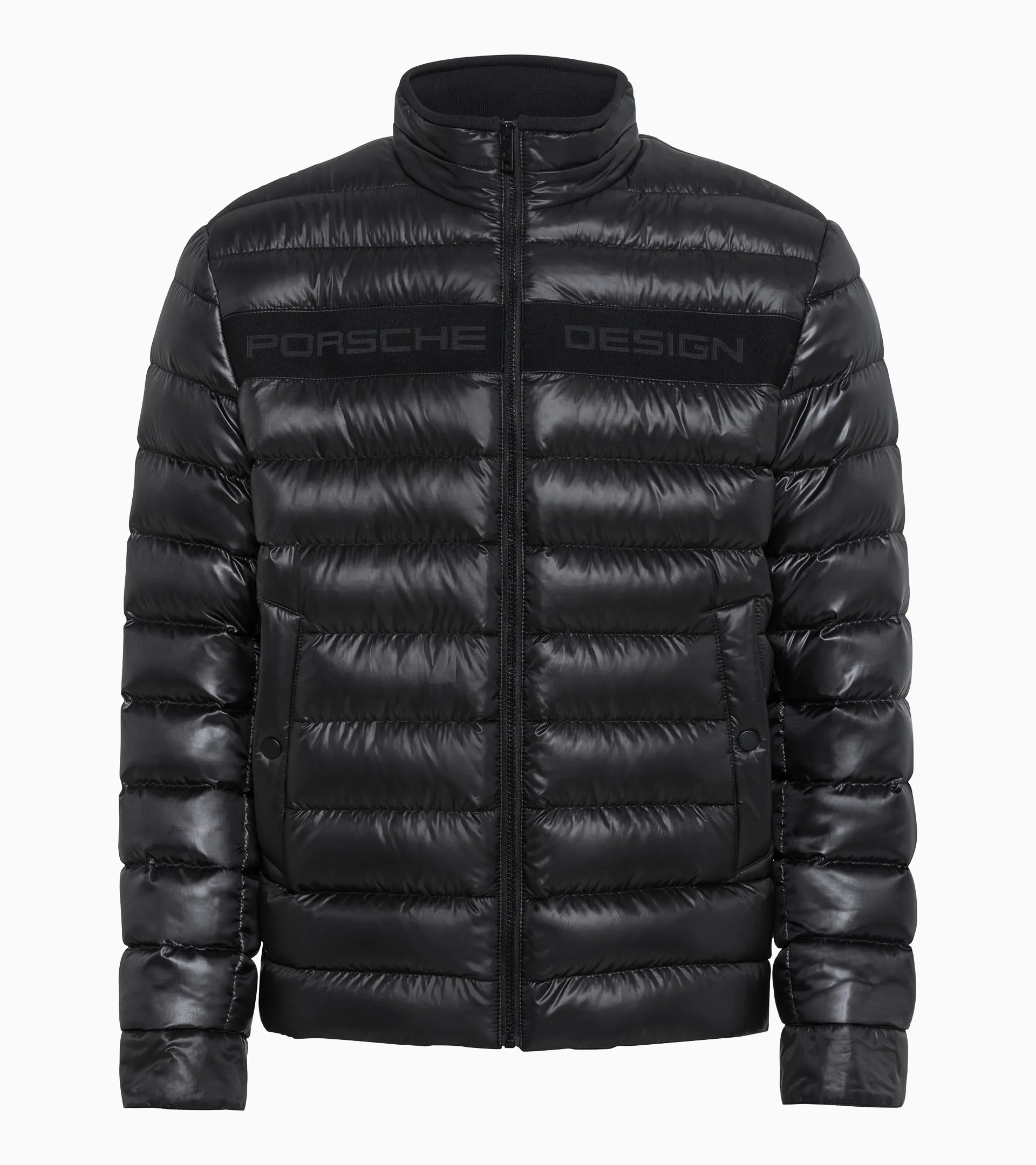 Light as a feather – without any feathers: the straight-cut jacket with down-free filling is perfect for the transitional seasons. The two pockets at hip height can be closed with press studs and the pockets on the inside can be closed with zips. Refined details typical of Porsche include the knitted fabric on the inside of the stand-up collar and the Porsche Design tape on the front of the jacket.