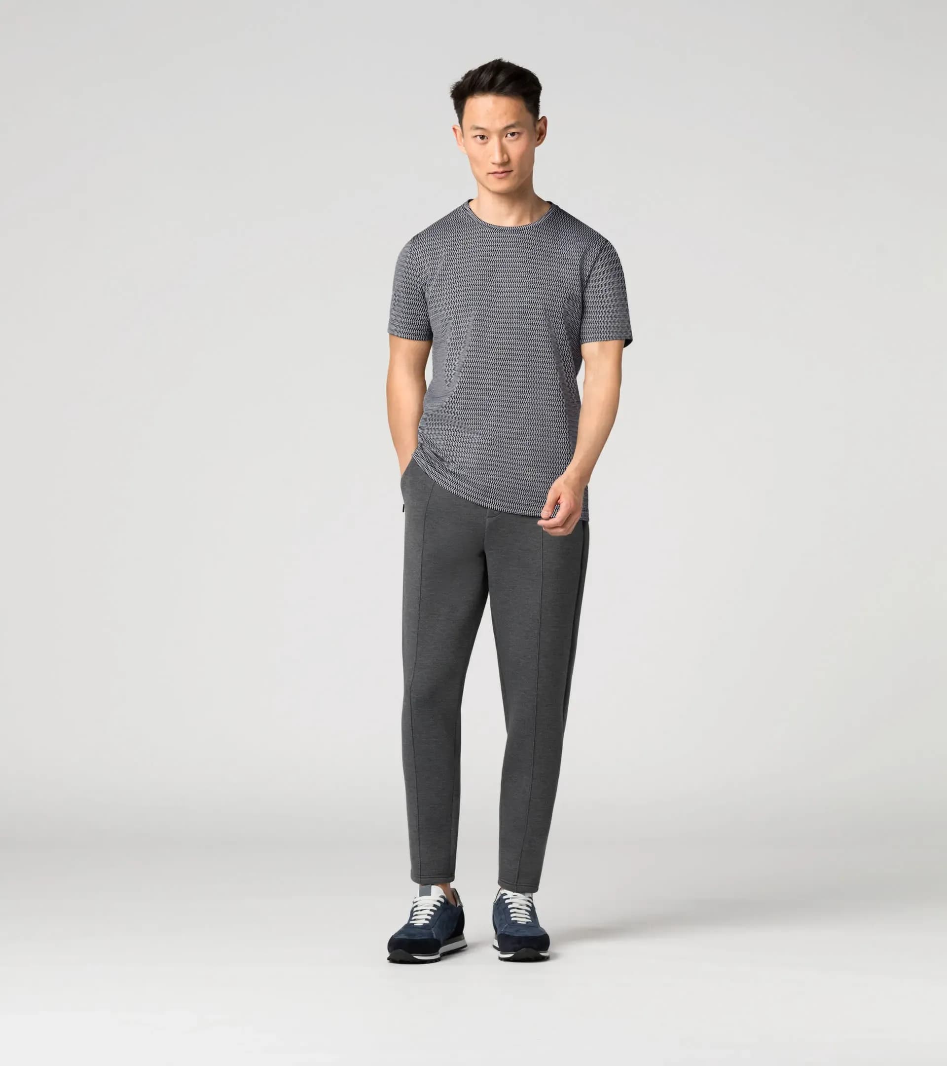 Minimalist designer crew neck T-shirt for men. Custom-made jacquard fabric made of cotton with technical pixel diamond pattern in contrasting colors.