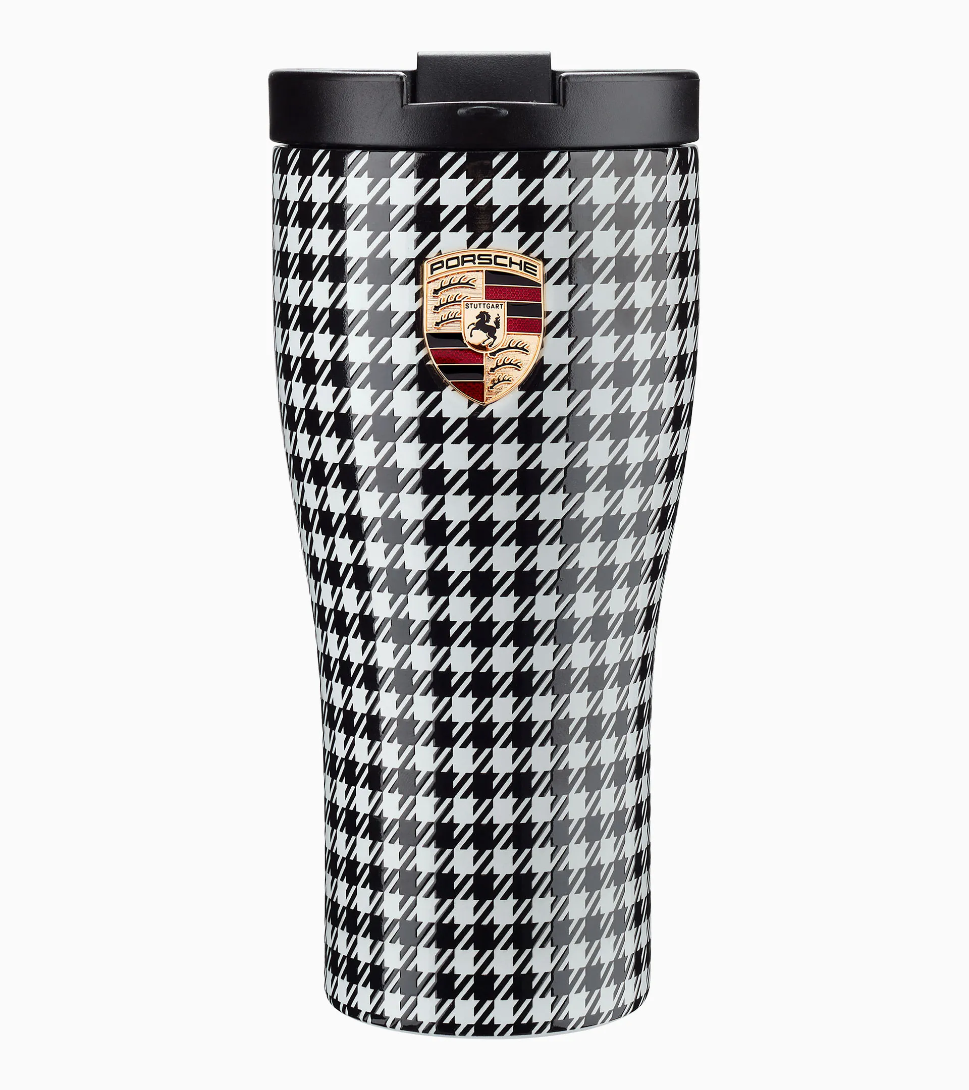 High performance to go: the double-walled Porsche thermos cup in the exclusive Pepita design keeps hot beverages warm and cold beverages cool. The body of the cup is decorated with the Porsche Crest, and the lid with embossed Porsche lettering. The high-quality packaging also makes it ideal as a gift for all Porsche fans. The cup with a capacity of approx. 460 ml is the ideal companion for on the road.