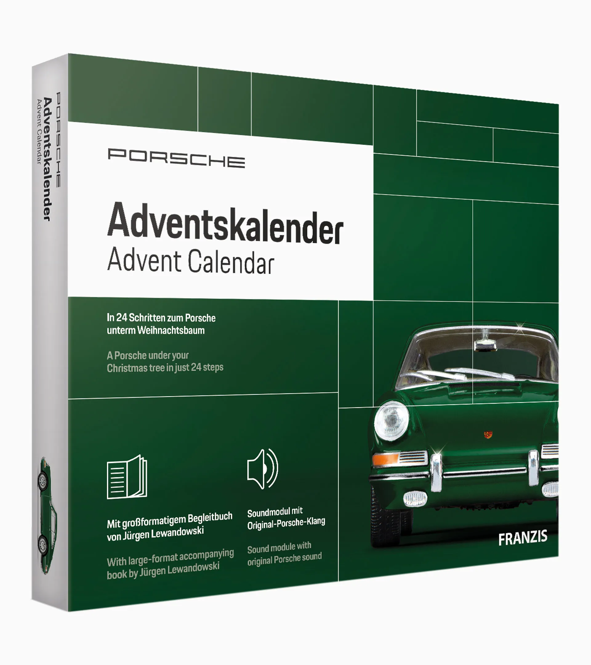 Porsche 911 advent calendar with faithfully detailed six-piece model kit in Irish green, red or blue.
