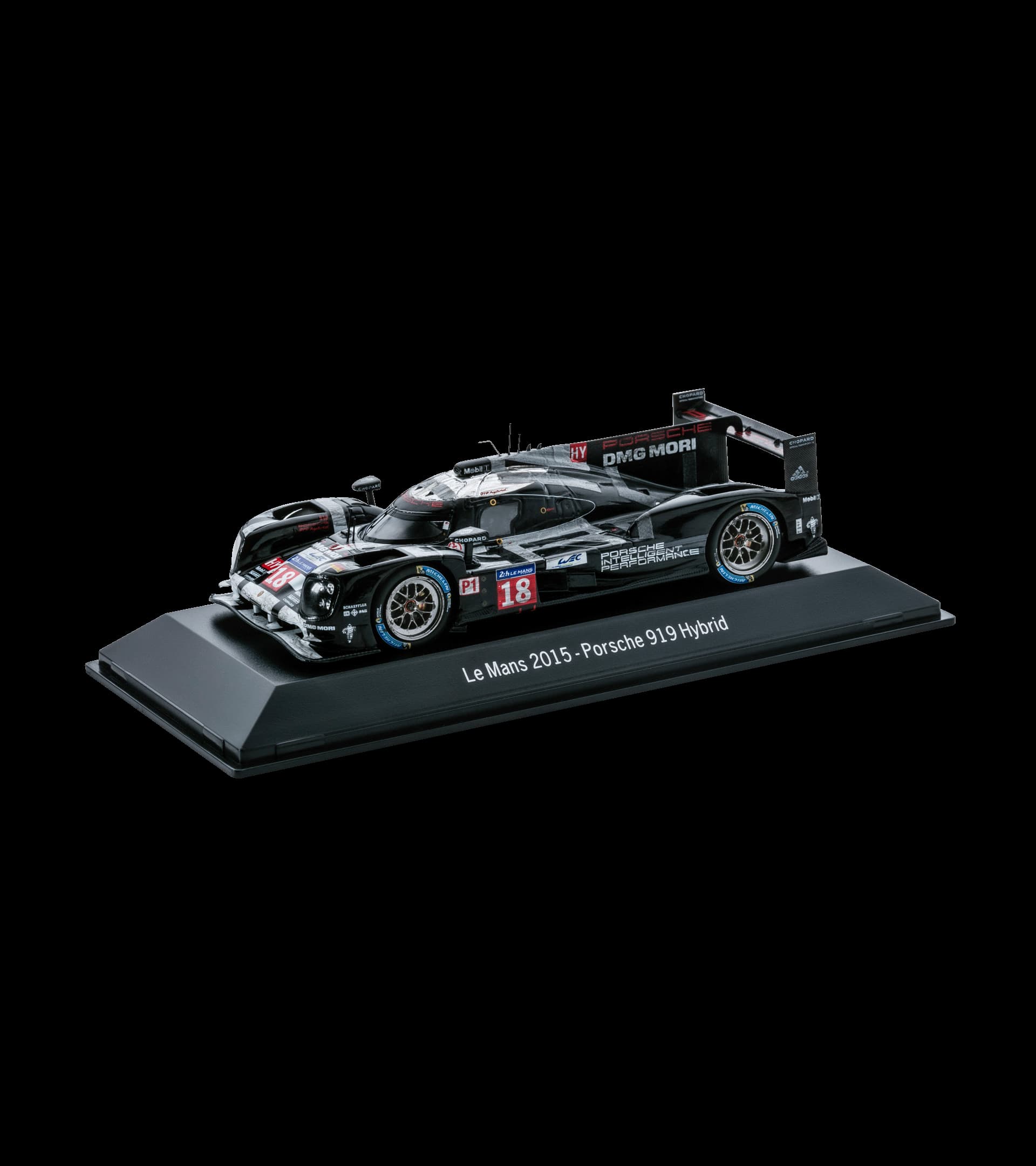 The Porsche 919 Hybrid is a prototype LMP1 racing car, which took to the starting line at the FIA World Endurance Championship (WEC) from 2014 to 2017. At the 24-hour race at Sarthe in 2015, Porsche celebrated its fourth double victory. The first three had come in 1971, 1987 and 1998. The black LMP1, starting number 18, symbolises the close technical relationship between the Porsche 919 Hybrid race car and the likewise hybridised Porsche 918 Spyder super Sports Car.