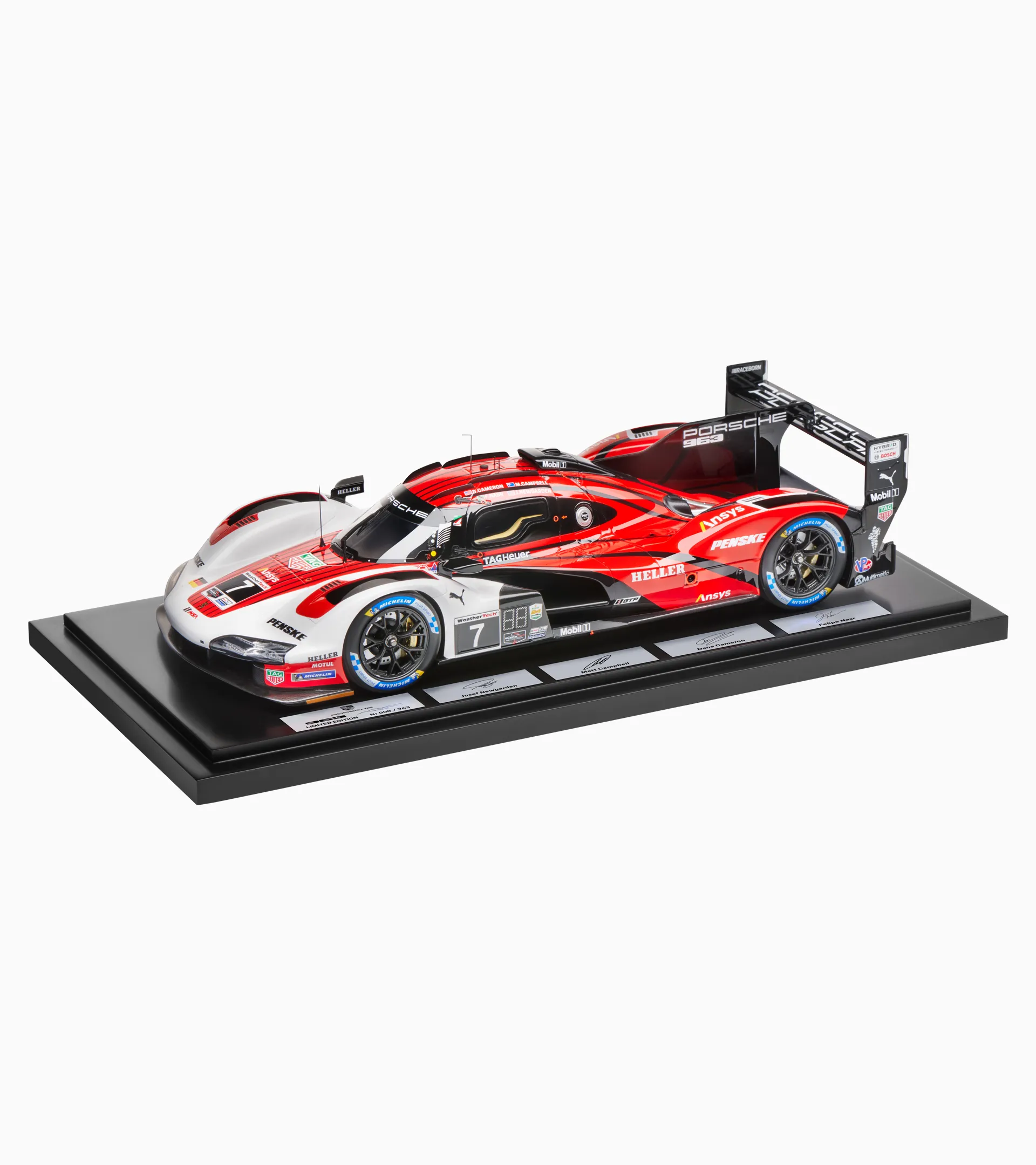 The exclusive 1:18 scale model of the Porsche 963 showcases impressive attention to detail and deserves its place in any collection. The packaging also makes it the perfect gift for all Porsche fans. Made of resin. White/Red/Black exterior, Black interior.