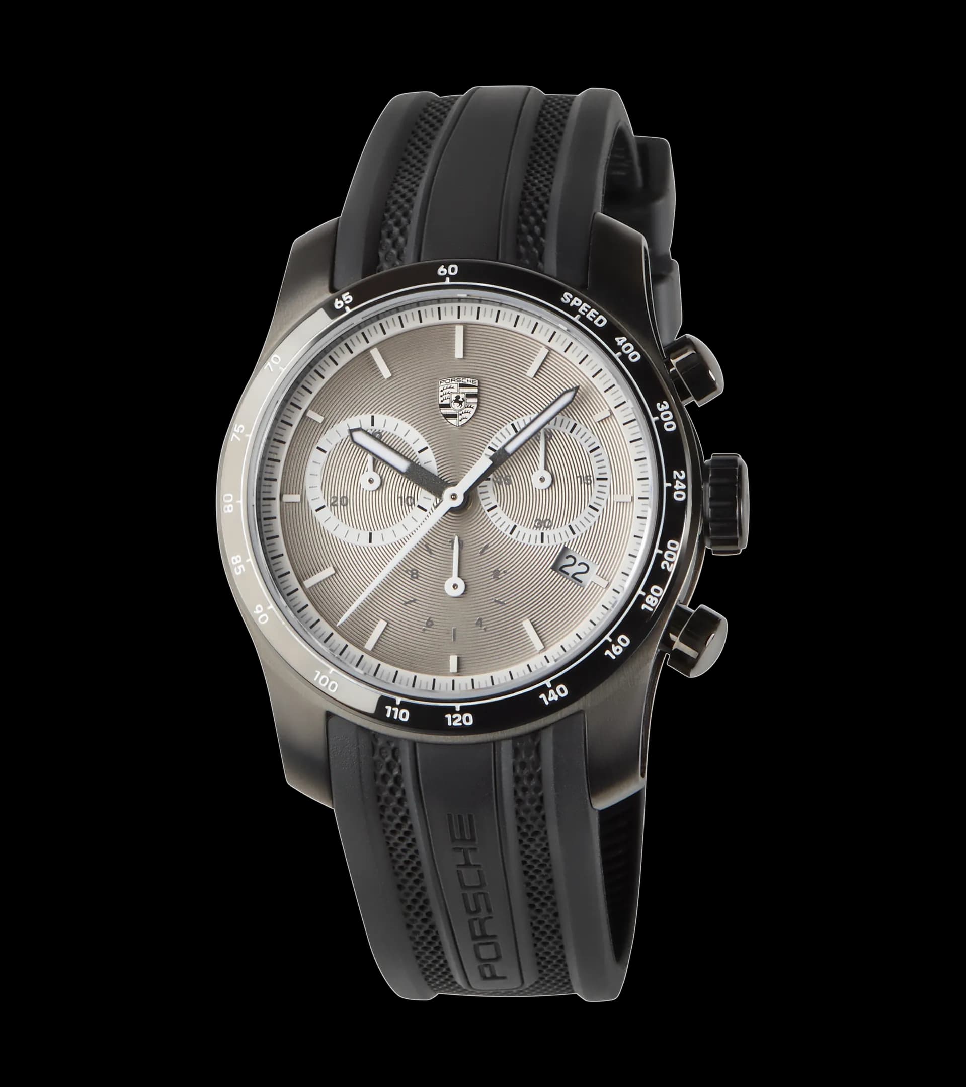 Swiss RONDA movement with 13 jewels. Two-piece stainless steel case with PVD coating in Dark Silver. Waterproof up to 10 atm. Metal dial with raised Porsche Crest at 12 o'clock. Sapphire glass with anti-reflection coating on one side. Rubber strap in Black with honeycomb structure on the top and tyre markings embossed on the underside. Stainless steel pin buckle with PVD coating in Dark Silver and engraved "PORSCHE" logo.