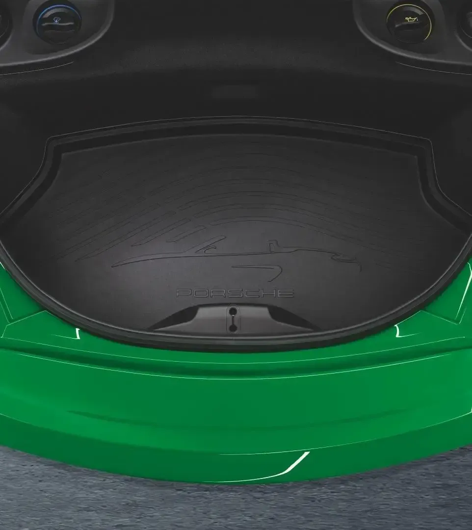 Custom-fit protective liner with "PORSCHE" logo and vehicle silhouette. Waterproof and washable.