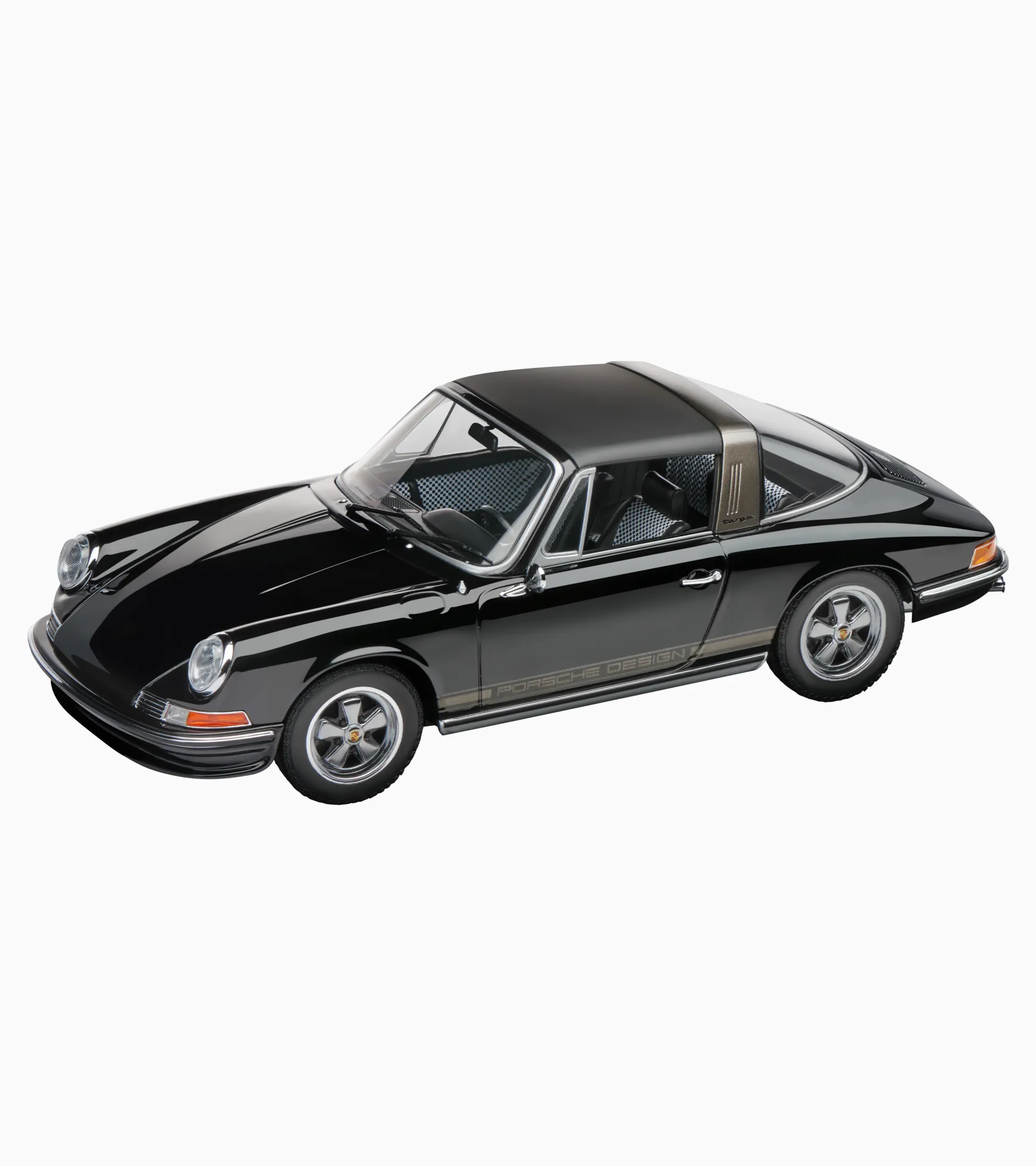 The exclusive 1:18 scale model of the Porsche 911 S 2.4 Targa 1972 50 Years of Porsche Design showcases impressive attention to detail and deserves its place in any collection. The packaging provided also makes it the perfect gift for all Porsche fans. Die-cast. Black exterior, Black interior.