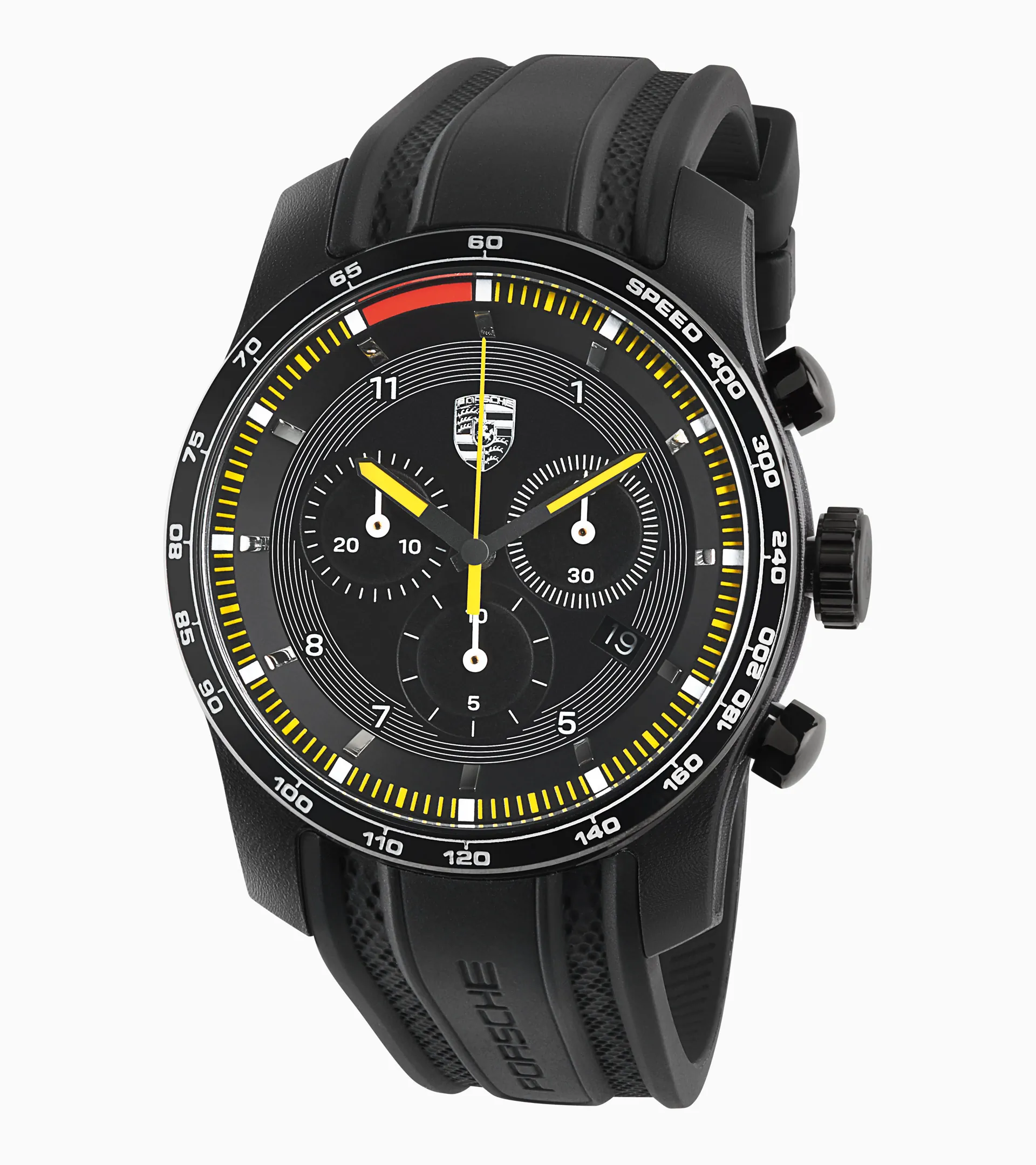 Sport Chronograph in carbon composite material, making the case particularly sporty and lightweight. Metal dial protected by scratch-resistant sapphire crystal with anti-glare coating on one side. Details in Racing Yellow and Guards Red. Super-LumiNova on the hour and minute hands and indices. With three totalisers, date display at 4 o’clock and integrated stop function. Powered by a Ronda movement with 13 jewels. Satin-finished, stainless-steel clasp in black PVD with engraved Porsche logo. Including high-quality watch packaging.
