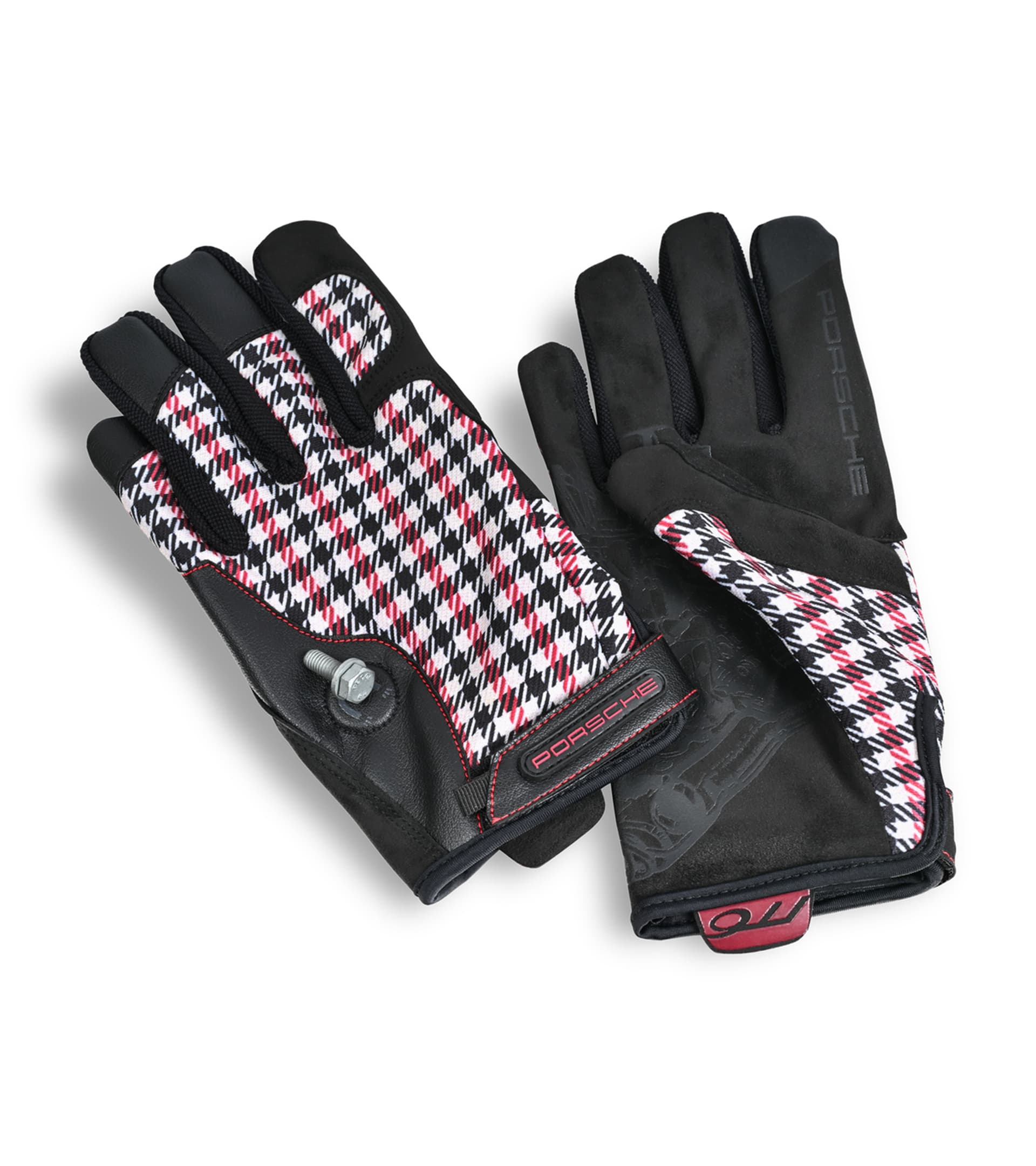 The assembly gloves from Porsche Classic are inspired by the pepita seat pattern of the early Porsche 911. The cutaway illustration of the 901 engine on the palm provides improved grip for the durable gloves in size 10 (equivalent to size XL).
