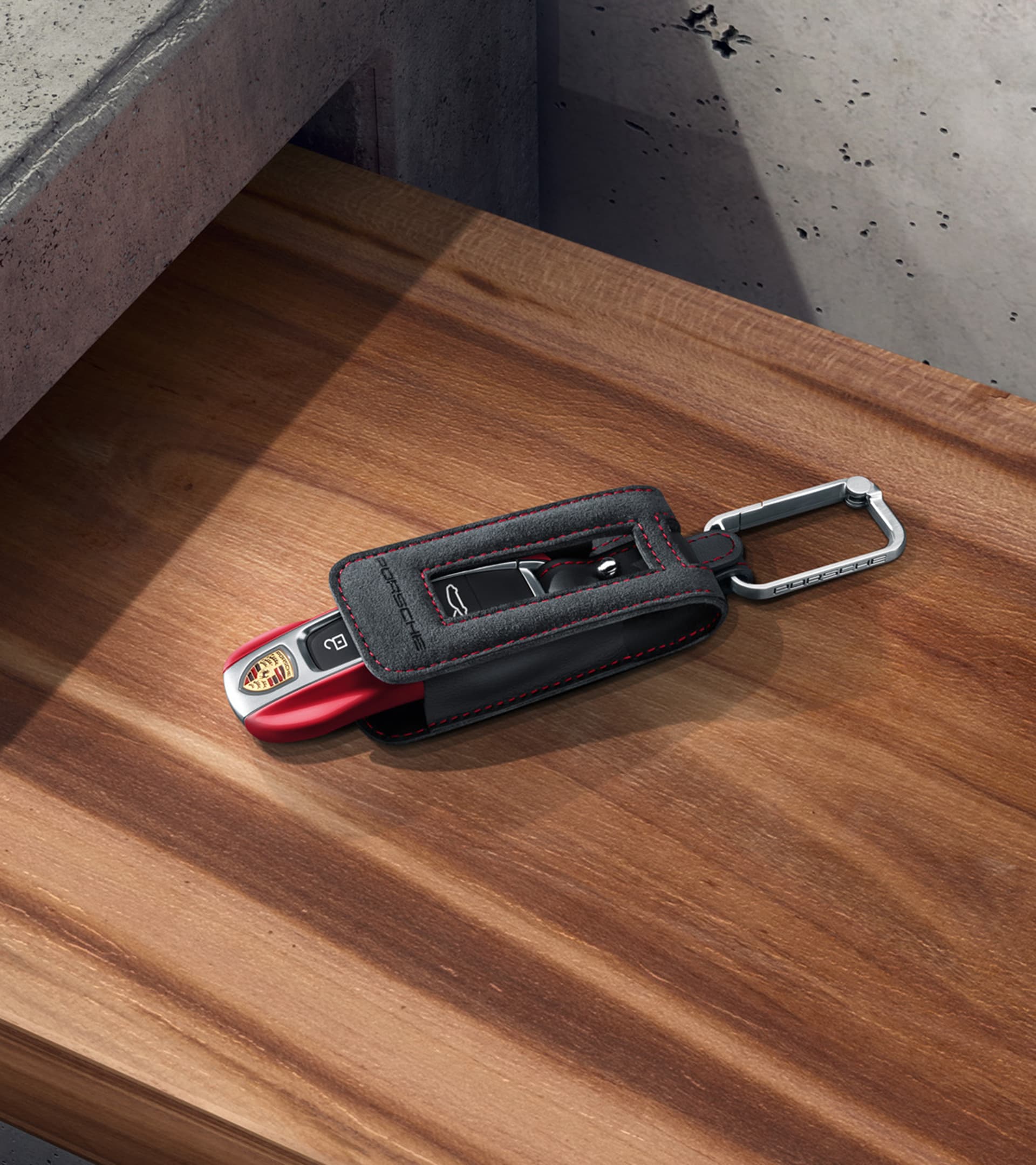 The lanyard and the side panels are in black leather. With decorative stitching in selected colours and "PORSCHE" logo.