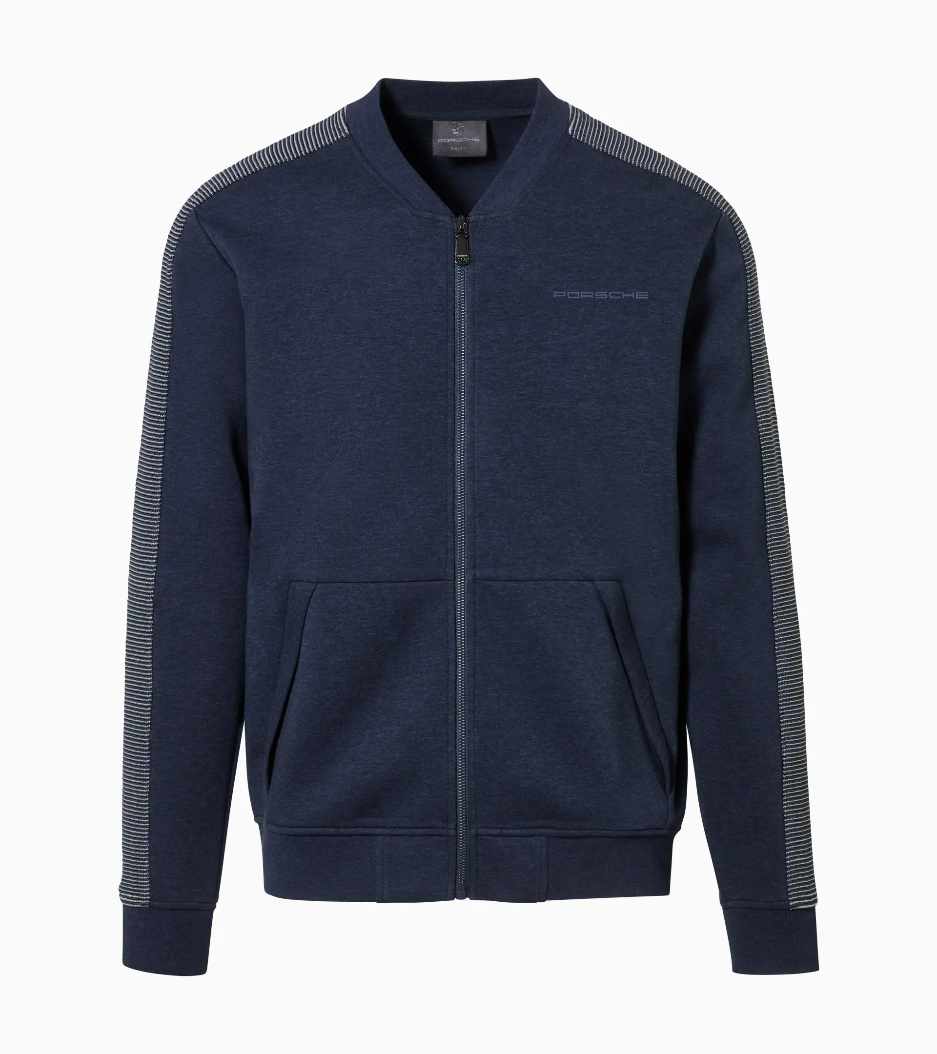 Sweat jacket with baseball collar and two side pockets. Top of arm with two-tone ribbed structure in light grey / dark blue. There is a 3D print design on the back, two different motifs show depending on angle.