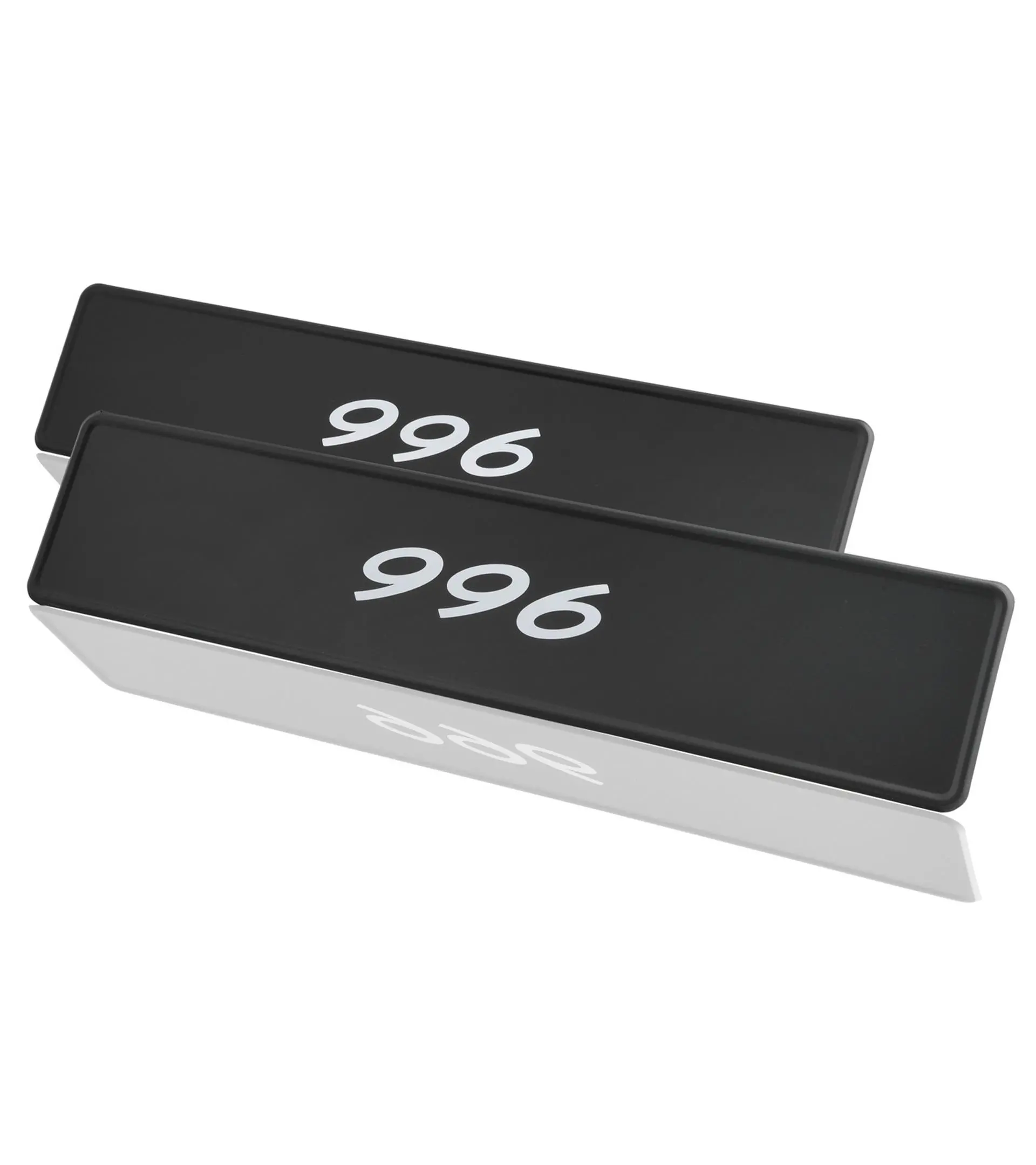 Black number plate with white "996" imprint measuring 11x52 cm; suitable for Porsche 996 from model years 1998 to 2005. Content: 2 pieces.