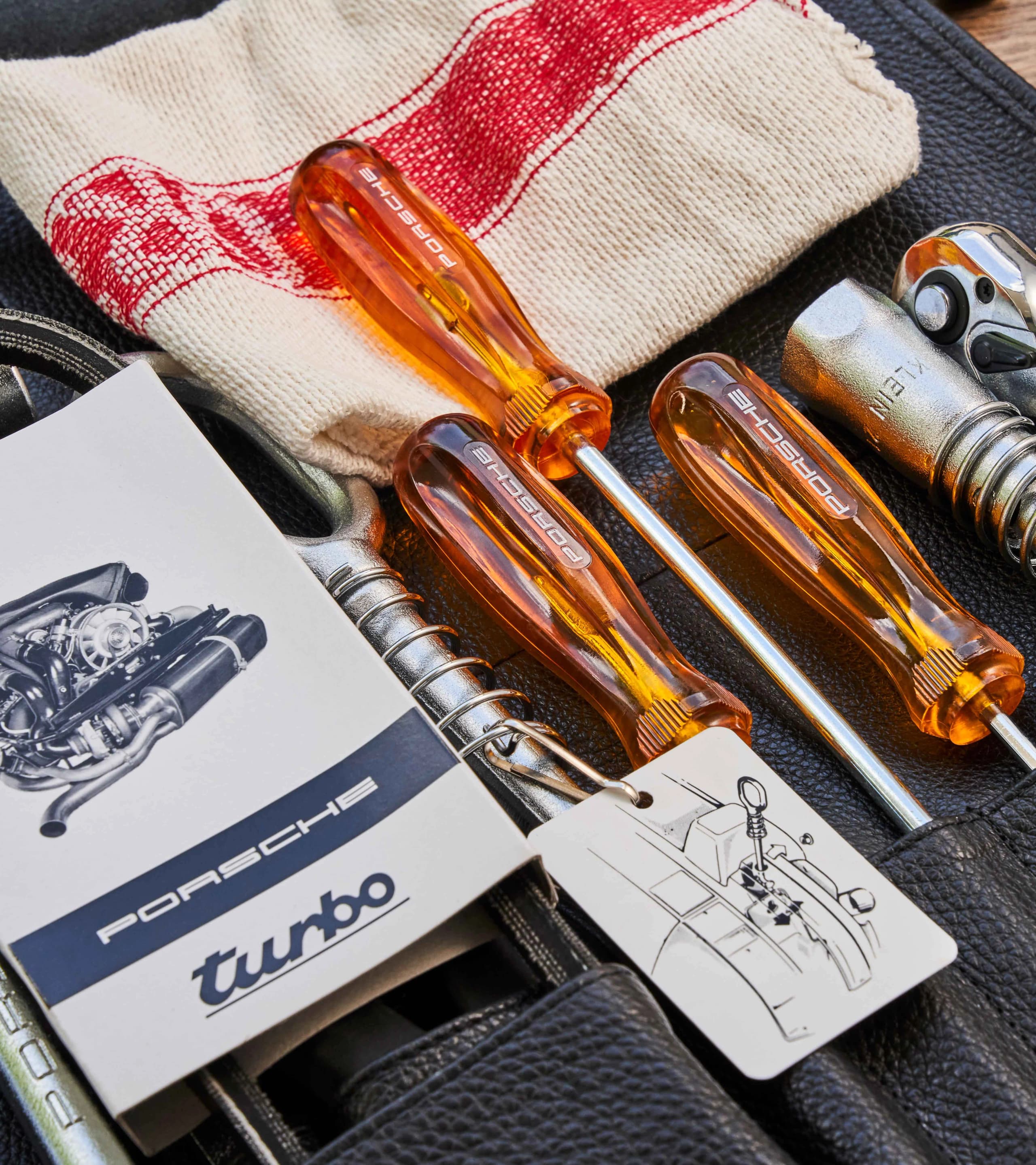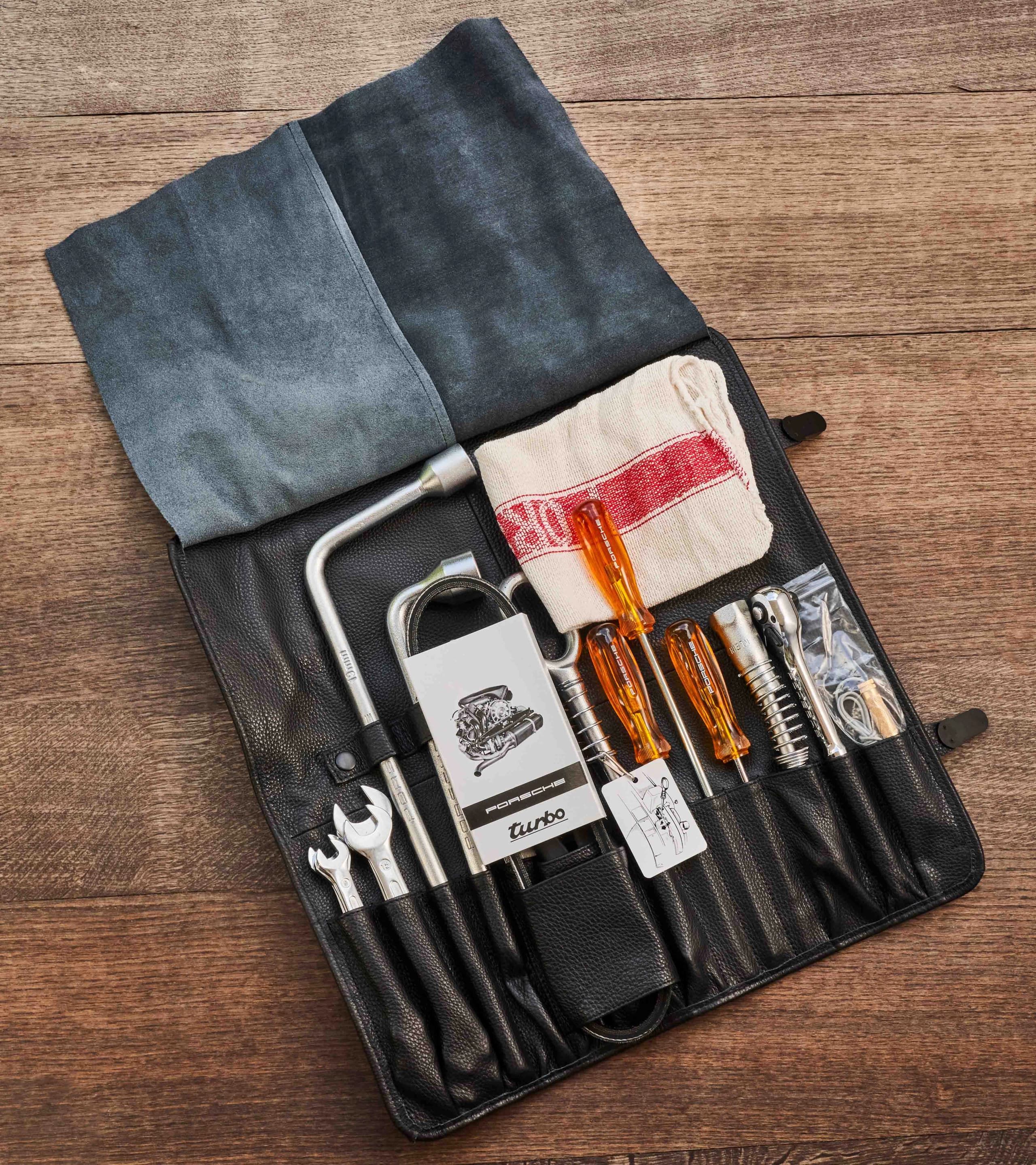 Porsche Classic tool bag; suitable for all Porsche 911 G from model years 1974 to 1982. Contents: 5x double open-ended spanners (one each: 8x9, 10x11, 12x13, 14x15 and 17x19), 1x wheel nut spanner, 1x special spanner size 22, 1x holding tool for V-belt pulley, 1x combination pliers, 1x V-belt, 1x towing lug, 1x flat-head screwdriver, 2x Phillips screwdrivers, 1x spark plug spanner, 1x spark plug ratchet spanner, 1x test lamp, 5x fuses, 1x cleaning cloth. Porsche Classic has redesigned this tool bag, producing a new edition with a spectacular look in the style of the late 1970s. Whereas the original featured only imitation leather, the new tool bag is made of real black leather and red tartan fabric. The design of the fabric is based on a typical seat cover from this era. Following on from the development of tool bags for the Porsche 356 and Porsche 911 F models, the range now includes a tool bag for the subsequent 911 models. These vehicles boast special features such as the towing lug, which comes complete with its own brief instructions and is designed as a bayonet hook allowing it to attach to the original trailer, which was fitted with a simplex hook. All tools have specified slots in this new bag as well. The screwdriver handles are made of yellow plastic just as before, but now also feature Porsche lettering. To make handling easier, Porsche Classic has replaced the original spark plug tool with a ratchet that features a special spark plug socket spanner and is much more practical to operate.