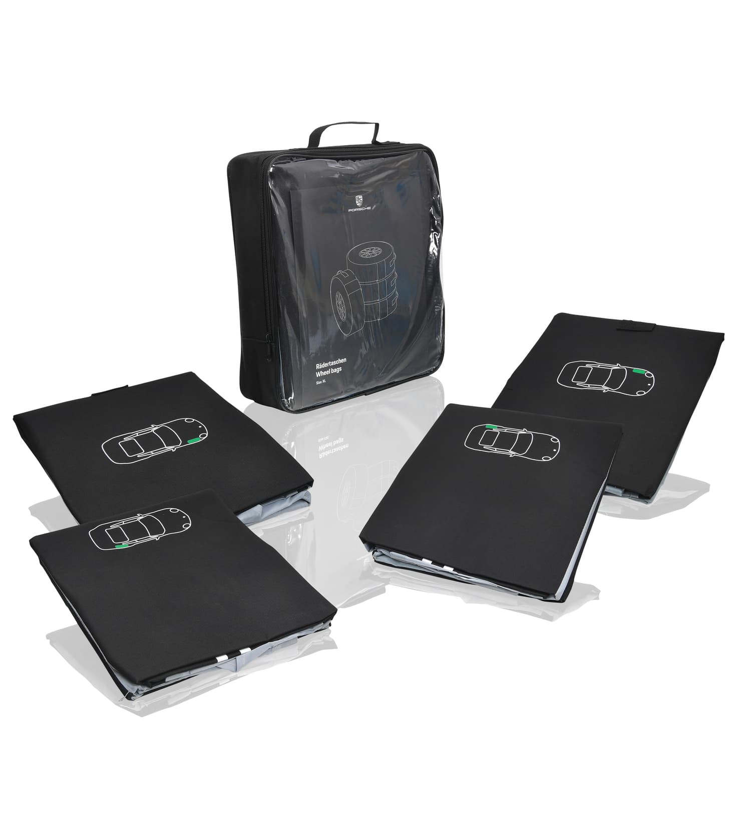 For clean storage of complete wheels: the Porsche wheel bags (size XL) in a set of four for tyre sizes 17-21 inches (tyre circumference of 2071 mm to 2310 mm and a diameter of 661 mm to 735 mm).