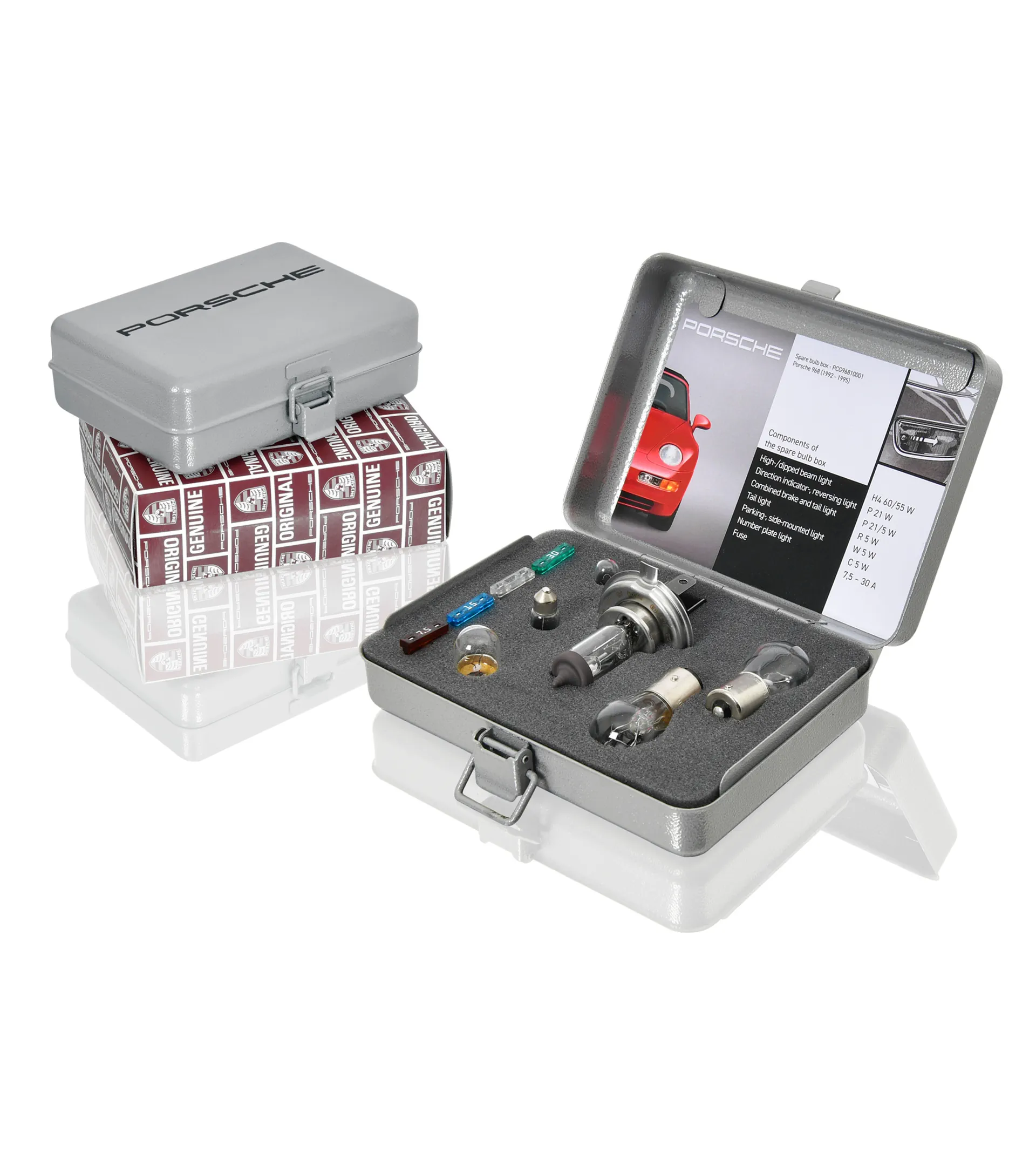 The bulbs and fuses are stored in a metal box in historic Porsche Red, with raised Porsche lettering in White and a foam insert inside.