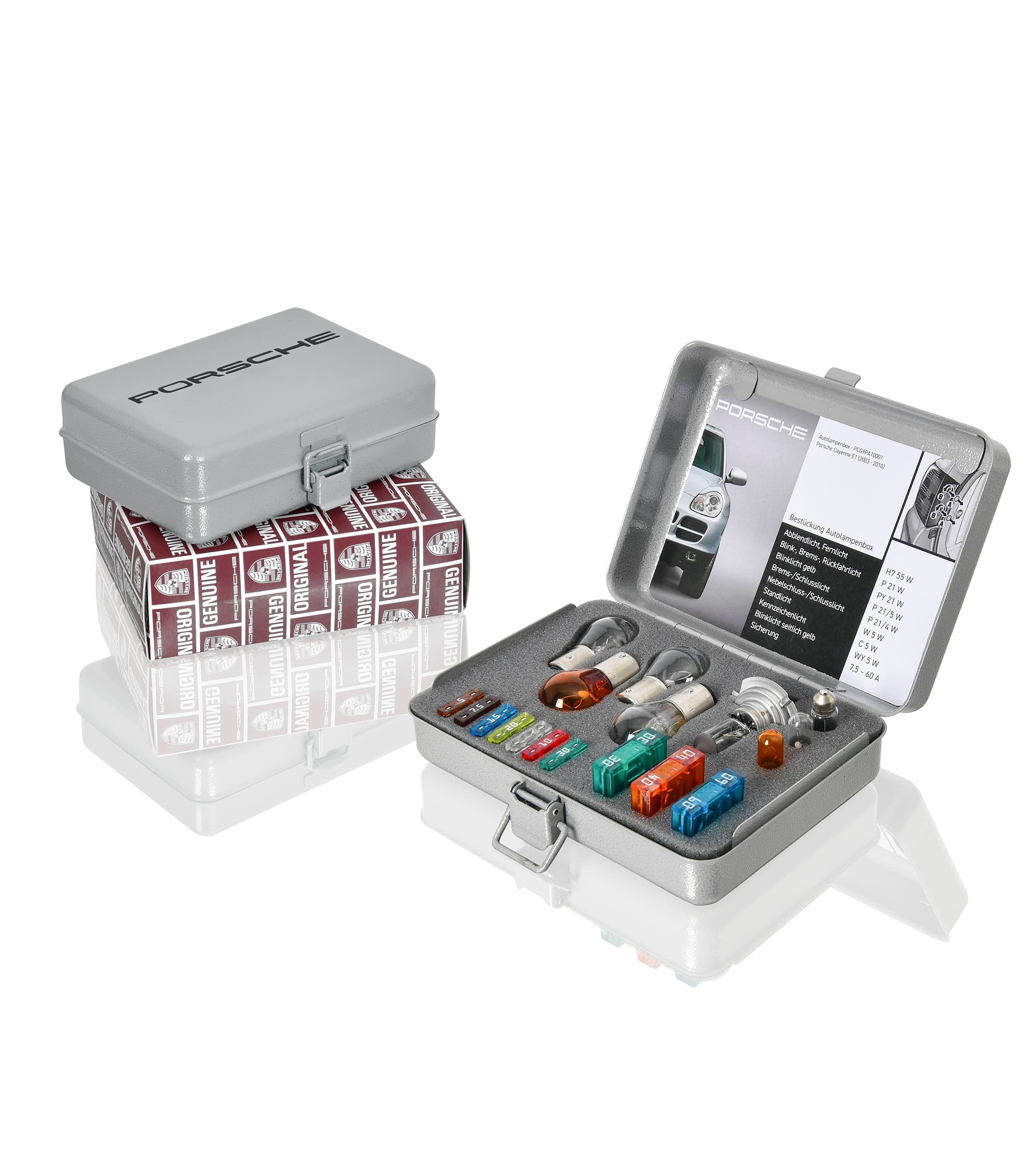 The bulbs and fuses are stored in a metal box in historic Porsche Silver, with raised Porsche lettering in Black and a foam insert inside.