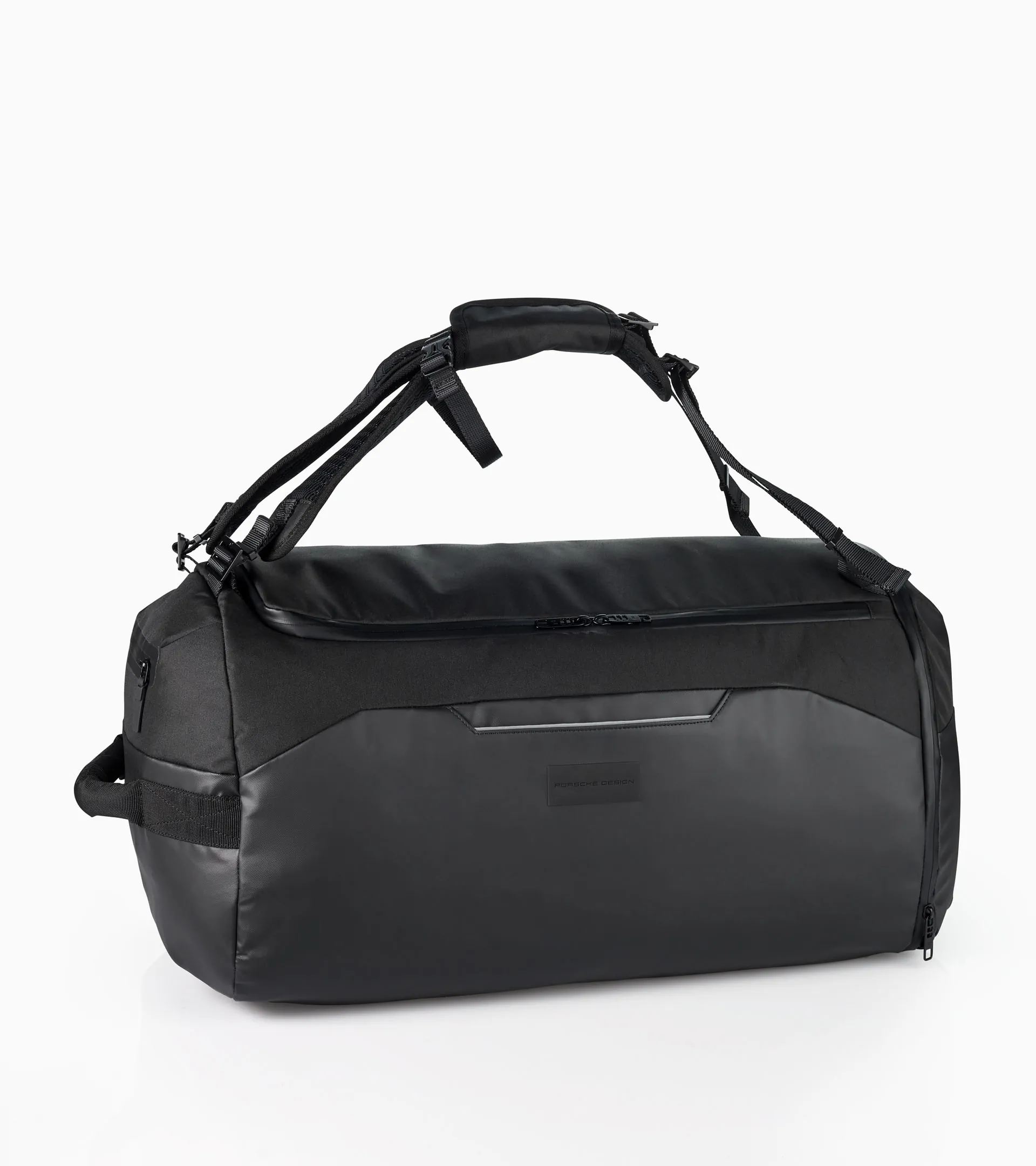 A fusion of smart style and sustainability, functionality and flexibility: the Porsche Design Urban Eco Collection doesn't really fit into any specific category, but it does fit perfectly into modern everyday life. The water-repellent duffle bag made of recycled polyester fabric and polyurethane is particularly abrasion-resistant and weatherproof. A spacious main compartment with a two-way zip offers enough space for every trip. Two slide-in compartments and various zip compartments ensure order and quick access to all important essentials. A specially designed shoe compartment and an additional side compartment with interchangeable zip pulls expand the storage options. The bag can be carried casually by hand or worn comfortably as a backpack with padded shoulder straps and chest strap. Reflective details on the front and a slide-in compartment underneath combine design and functionality. The Porsche Design branding on the back as well as uniquely designed decorative elements and fittings complete the stylish look of the bag.