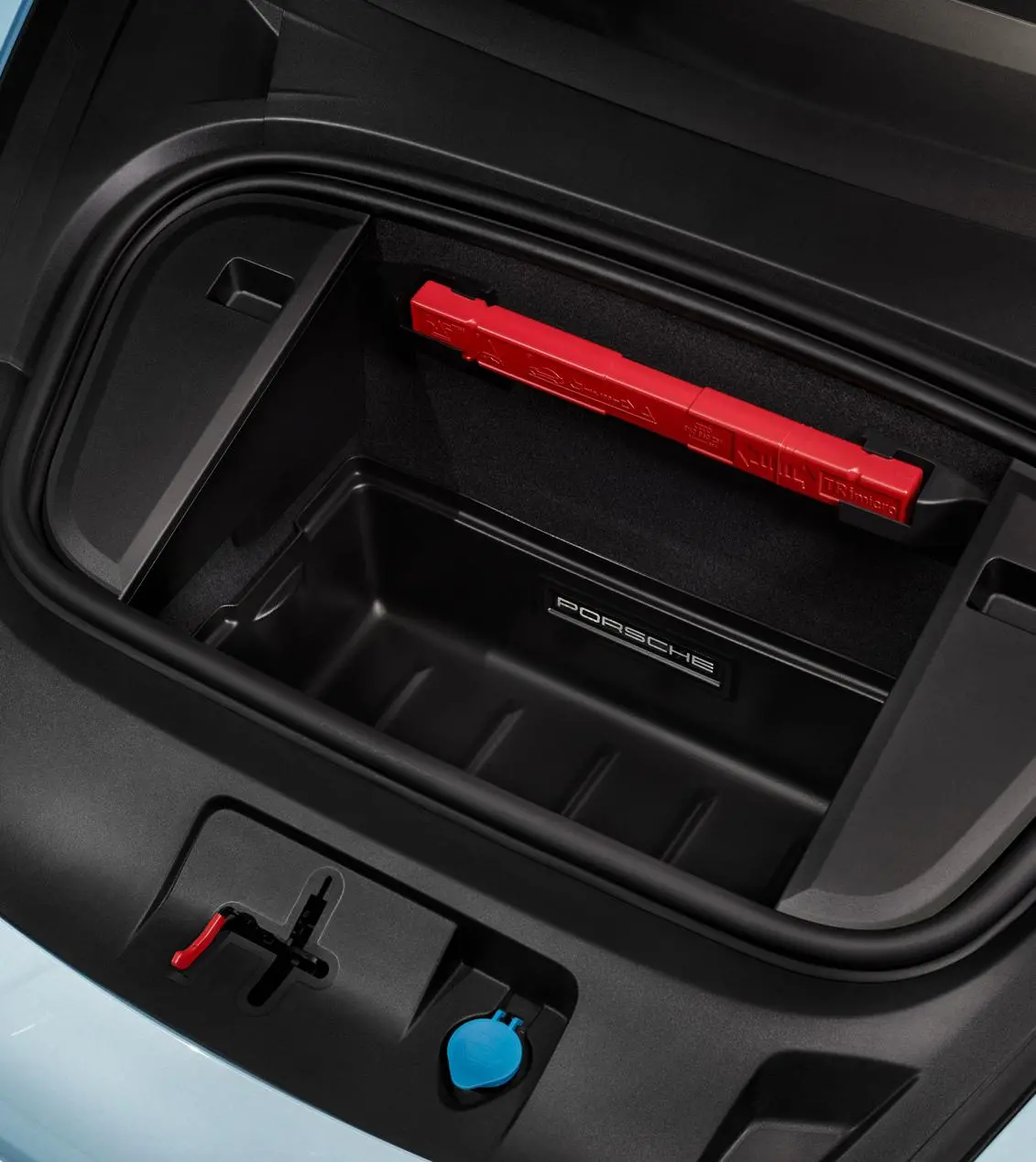 The tailor-made luggage compartment lining for the Taycan effectively protects the front luggage compartment from dirt, moisture and wear. 'PORSCHE' lettering adorns the black protective tray, which has impressive functionality and an attractive design. The deep luggage compartment liner is made of a high-quality, waterproof material and can be easily removed using the side handles. This means the luggage compartment will always be in perfect condition and ready for whatever adventures you want to experience with your Taycan.