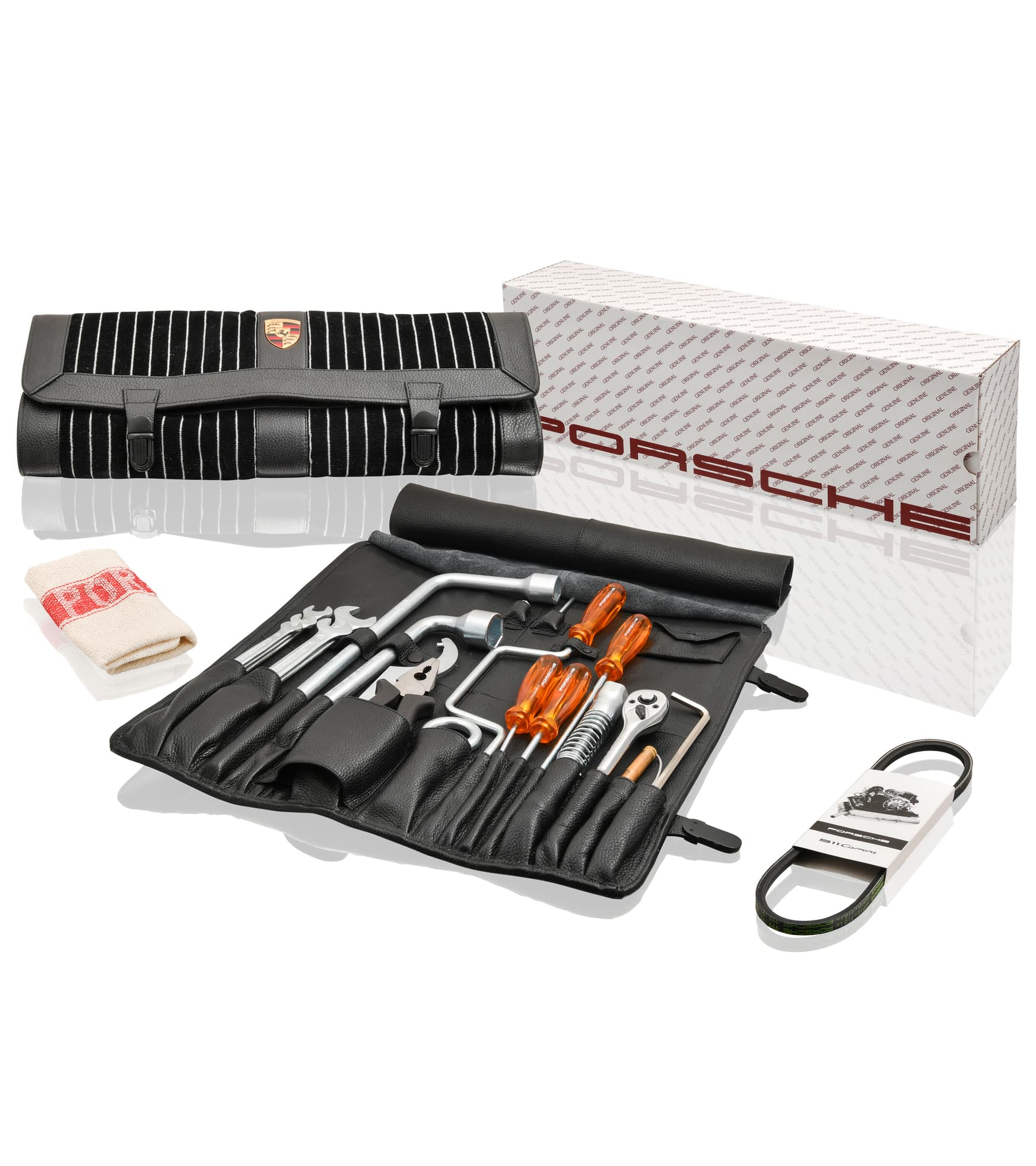 Porsche Classic tool bag; suitable for all Porsche 911 G from model years 1983 to 1989. Contents: 5x double open-ended spanners (one each 8x9, 10x11, 12x13, 14x15 and 17x19), 1x wheel nut spanner, 1x special spanner size 24, 1x holding tool for V-belt pulley, 1x combination pliers, 1x V-belt, 1x towing lug, 1x hand crank, 1x Phillips screwdriver, 1x flat-head screwdriver, 1x spark plug spanner, 1x spark plug ratchet spanner, 1x special hexagon spanner, 1x test lamp, 1x flat crank attachment, 1x hexagon crank attachment, 5x fuses, 1x cleaning cloth.