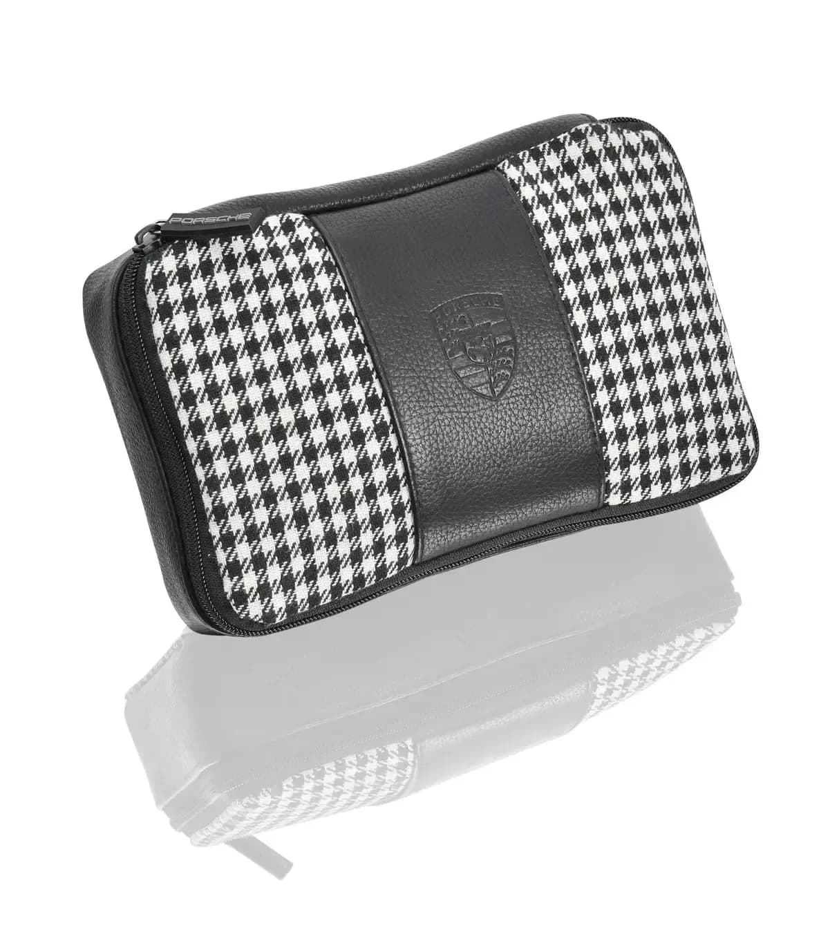 Klasszikus autójához a Porsche Classic-tól: elsősegélydoboz modern Pepita kivitelezésben és fekete bőrben dombornyomott Porsche címerrel.