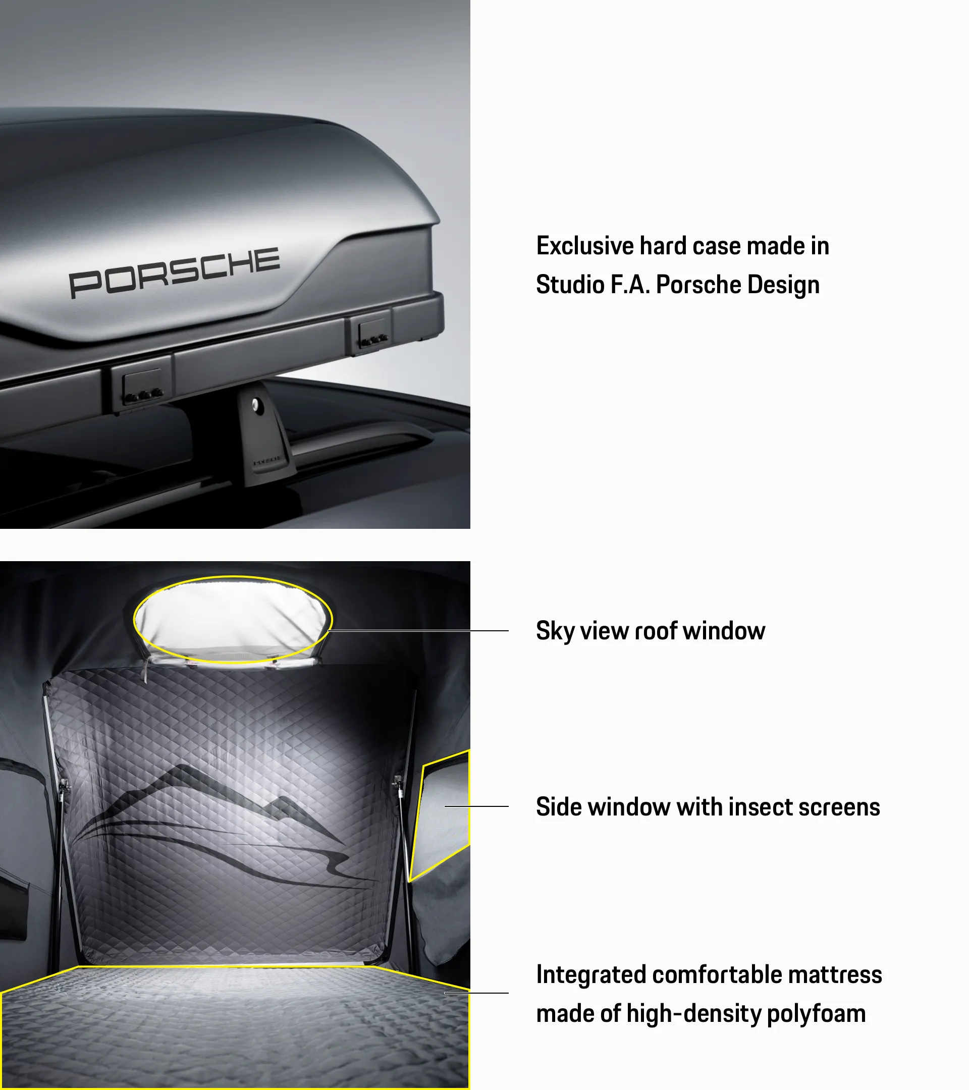 A Weissach-i fejlesztőközpontban tervezett kemény tok fekete/világosszürke vagy fekete/sötétszürke színkombinációban beszerezhető. A Zell am See-ben található Studio F.A. Porsche által tervezett tok mindkét oldalán jellegzetes, matt fekete „PORSCHE” felirat található. Az év minden szakában használható sátor légáteresztő pamutkeverékkel, vízálló cipzárral és a bejárathoz tartozó, kiegészítő esővédővel rendelkezik. Az oldalai különösen szemet gyönyörködtetők. Ezek a 911 legendás „Flyline” kontúrját idézik és „PORSCHE” felirattal rendelkeznek. A belső tér is kiemelkedő elemekkel rendelkeznek, többek között szigetelő, világosszürke színű, steppelt béléssel, amely a fejrészen hegyi sziluettel rendelkeznek. A steppelt minta megtalálható a beépített, kényelmes, nagy sűrűségű polifoam matracon is.