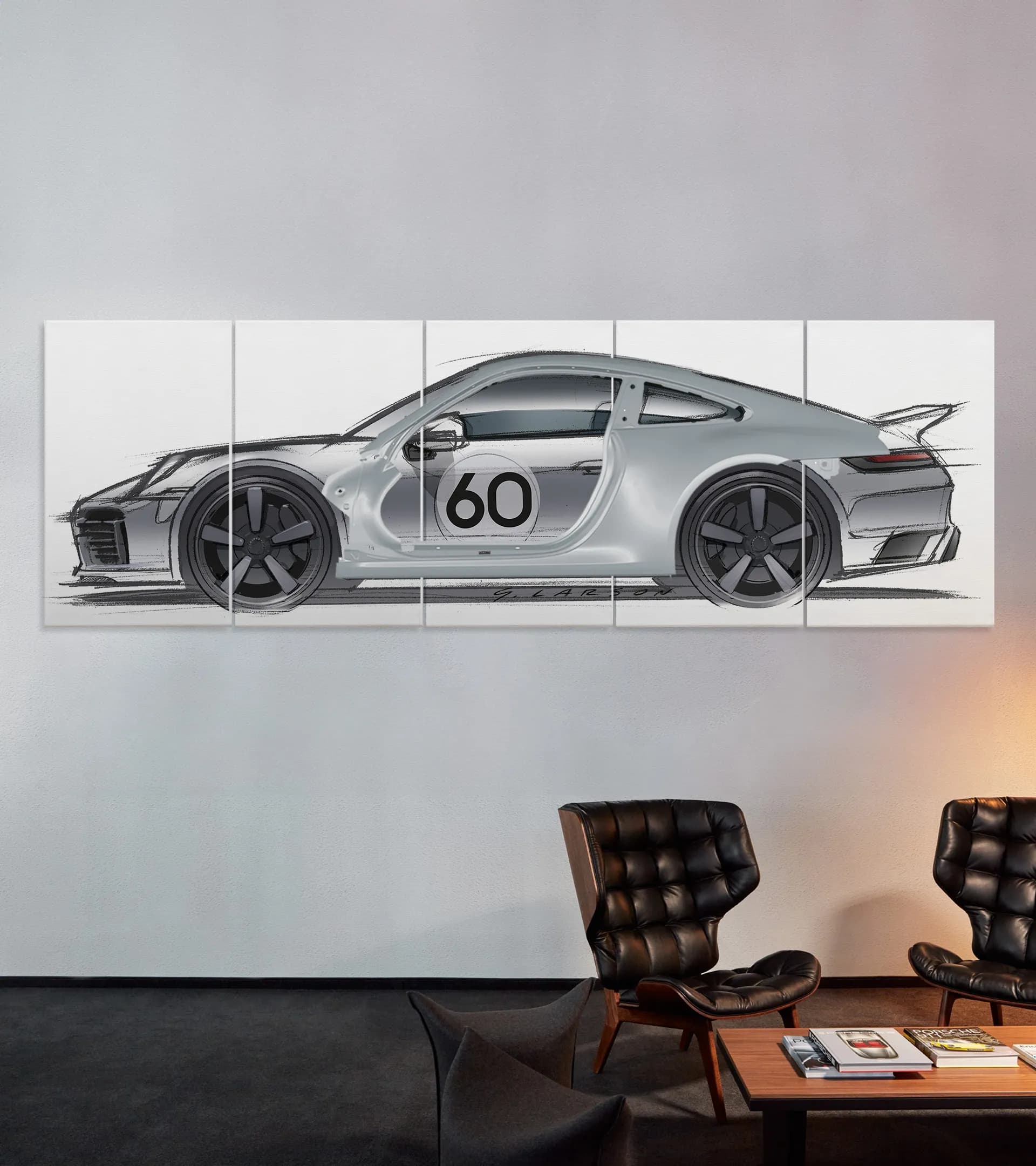 The thrill of Porsche at home: a limited-edition, customisable wall installation consisting of an original 911 Sport Classic [992] body part with a design sketch by Grant Larson on the rear panel. Aluminium side panel, painted in one of three Porsche exterior colours. Five-piece aluminium rear panel, Black or White, each framed in a Silver anodised aluminium frame. Limited to 60 units worldwide.