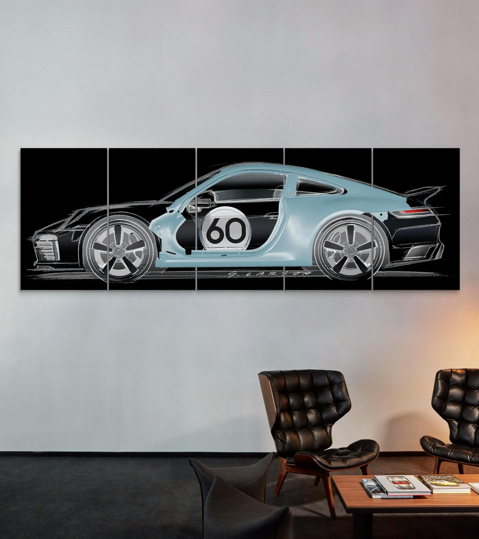 The thrill of Porsche at home: a limited-edition, customisable wall installation consisting of an original 911 Sport Classic [992] body part with a design sketch by Grant Larson on the rear panel. Aluminium side panel, painted in one of three Porsche exterior colours. Five-piece aluminium rear panel, Black or White, each framed in a Silver anodised aluminium frame. Limited to 60 units worldwide.