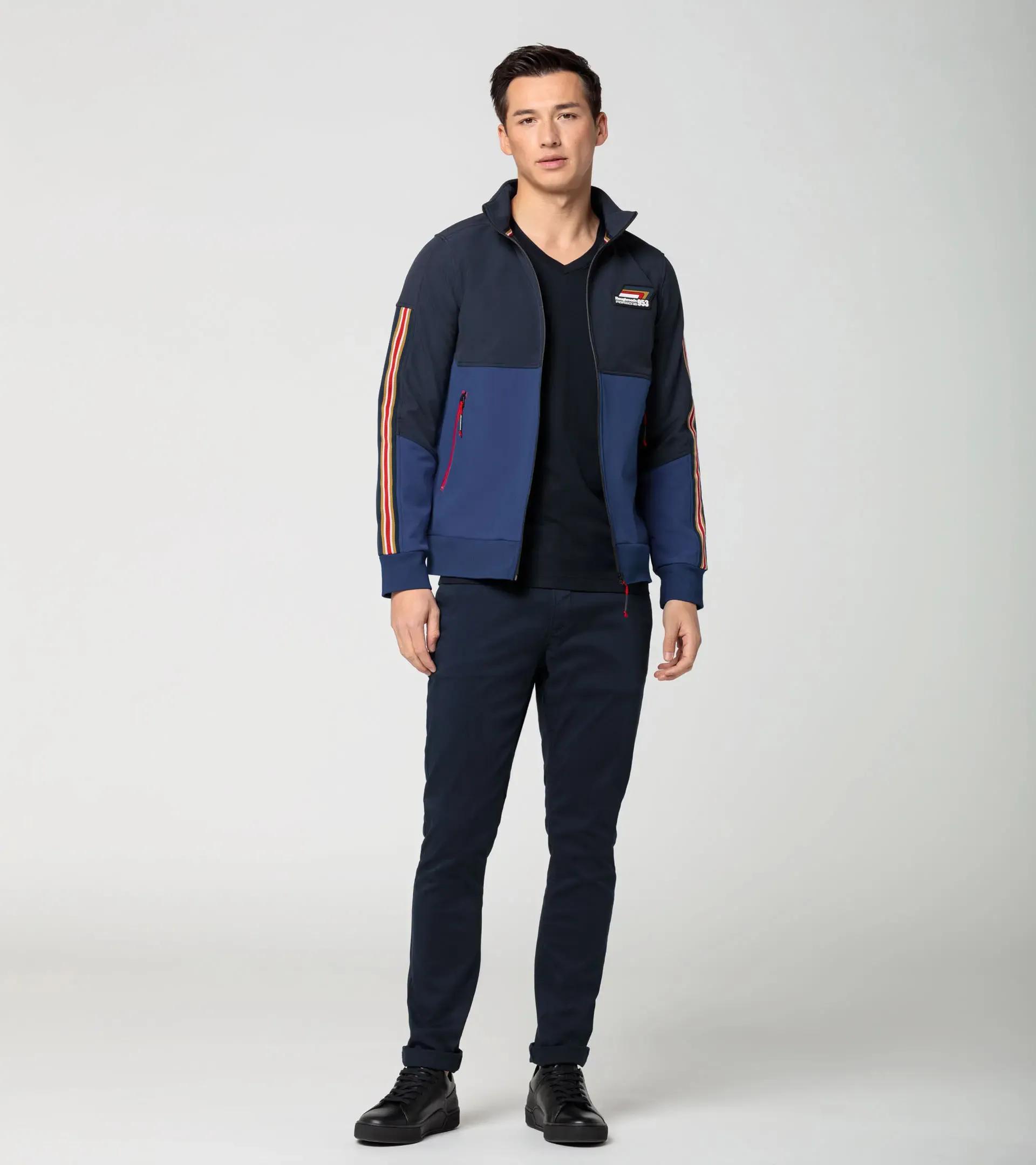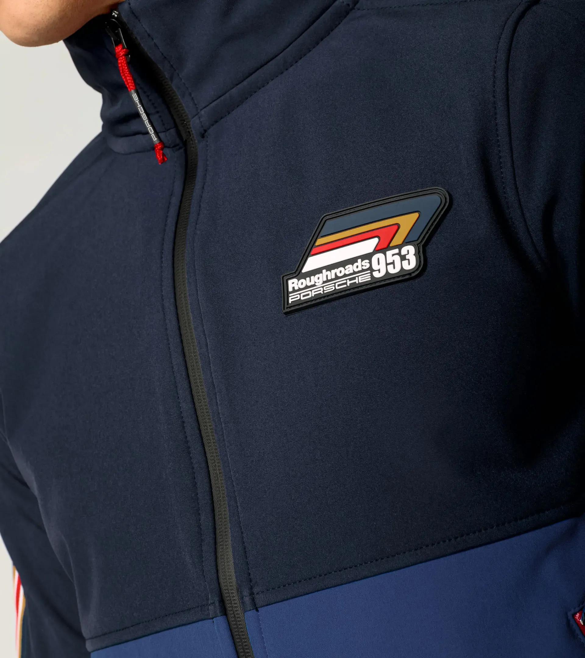 Look good, perform well: The regular-fit colour-block training jacket from the Roughroads collection combines sportiness with style. Its protective stand-up collar and practical side pockets with zips make it the perfect companion in wind, rain and at high speeds. The sophisticated lines on the front and back and stripe details on the sleeves emphasize the dynamic look of the jacket. The band on the high-quality, well-crafted inside is also striped. Other highlights include personalized zip pullers on the zips, the Roughroads rubber badge on the chest, and the 3D Porsche logo on the back of the training jacket.