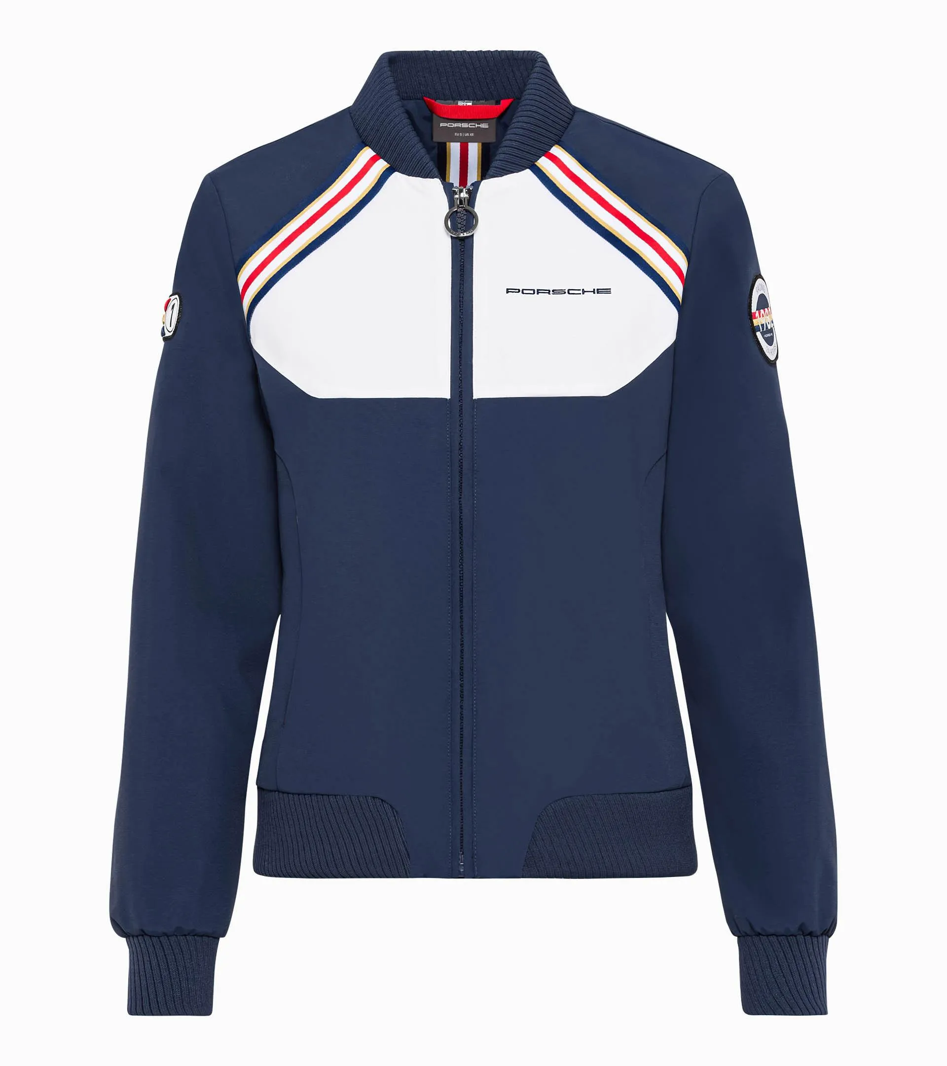 Casual but stylish: Women's jacket with baseball collar from the Racing collection, inspired by the legendary Porsche 956in Racinglivery. The embellished belt, Racing logo and red pleat round off this piece perfectly.