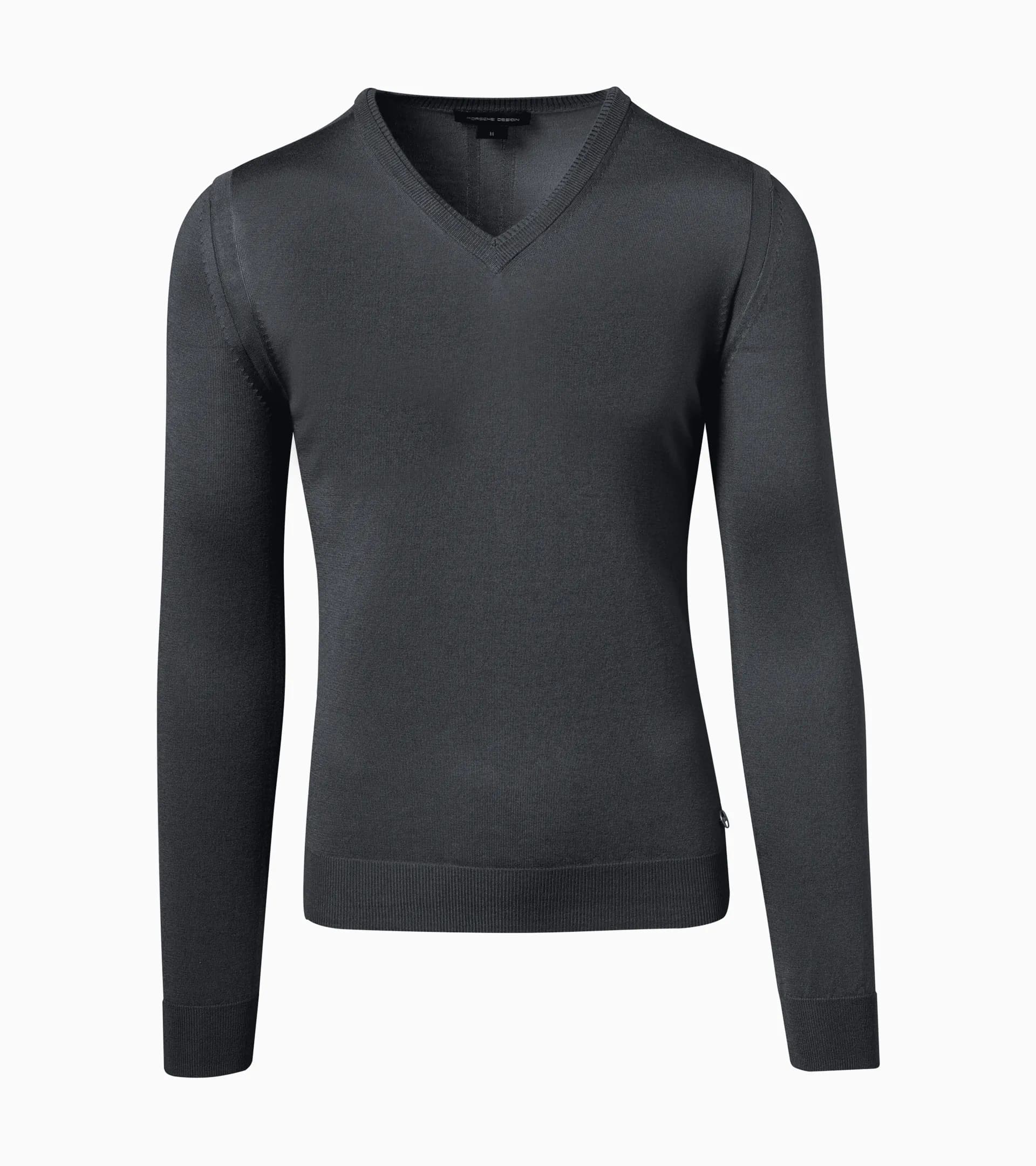 Morbido pullover firmato da uomo con doppio scollo a V e dettagli sportivi Porsche Design intessuti. Esclusivo misto seta-cashmere.