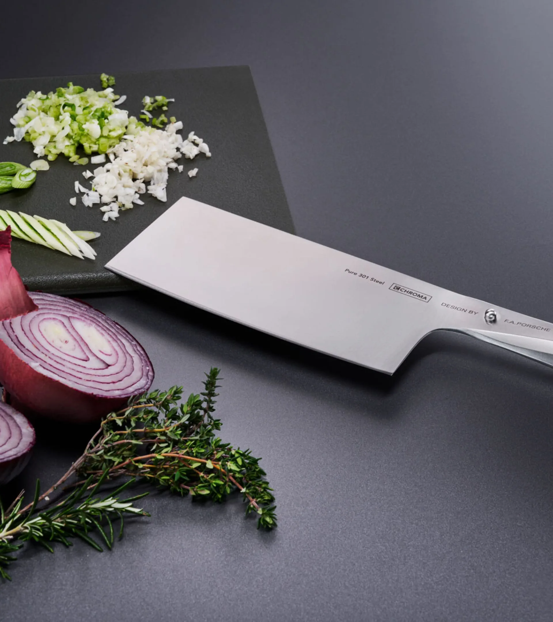 Questo coltello cinese da chef di Porsche Design è più di un semplice attrezzo: è un emblema di design eccezionale e maestria professionale nella tua cucina. Con una lama lunga 17,3 cm, questo coltello è essenziale per la cucina orientale e perfetto per tagliare pesce, carne e verdure. Colpisce per l'eccellente qualità di taglio e l'eccellente ergonomia.Manico e lama si fondono perfettamente garantendo una maneggevolezza armoniosa e fluida. Il tallone pronunciato in acciaio inossidabile segna con discrezione il passaggio tra lama e manico, fungendo al contempo da appoggio ideale per il pollice e l'indice. Il manico dal design ergonomico è volutamente ispirato ai metodi di lavoro degli chef professionisti, che utilizzano i coltelli con angoli di taglio variabili. Le speciali tacche sul manico rendono il coltello comodo e flessibile da maneggiare e consentono di variare la posizione di presa.Realizzata in acciaio giapponese Pure 301 di alta qualità, la lama garantisce longevità e un'affilatura eccezionale in grado di soddisfare anche le esigenze più elevate. Design by Studio F. A. Porsche.