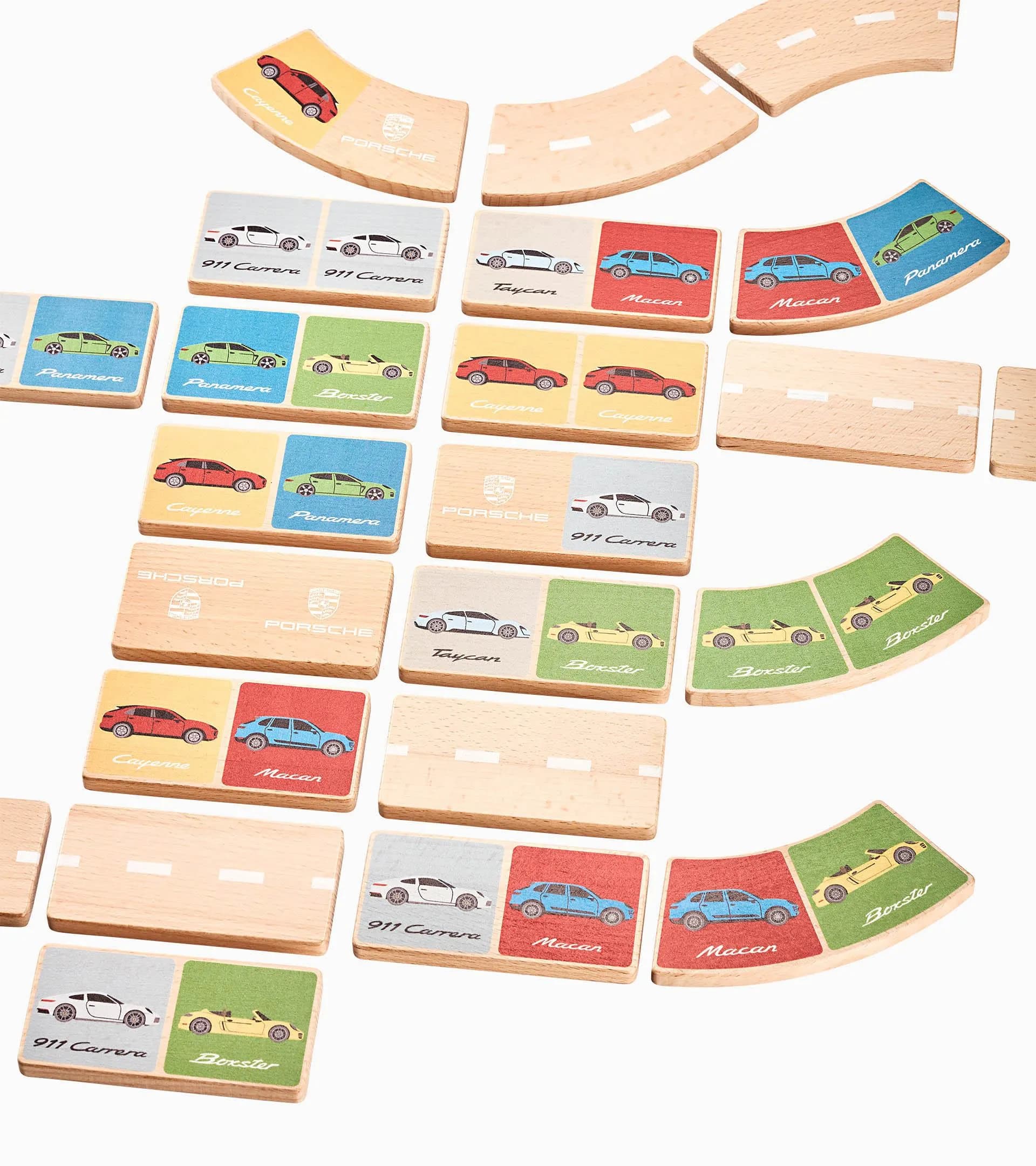 Una Porsche dopo l`altra: i 28 pezzi di questo domino di elevata qualità mostrano vari modelli Porsche e lo stemma del marchio. Divertimento assicurato per grandi e piccini.