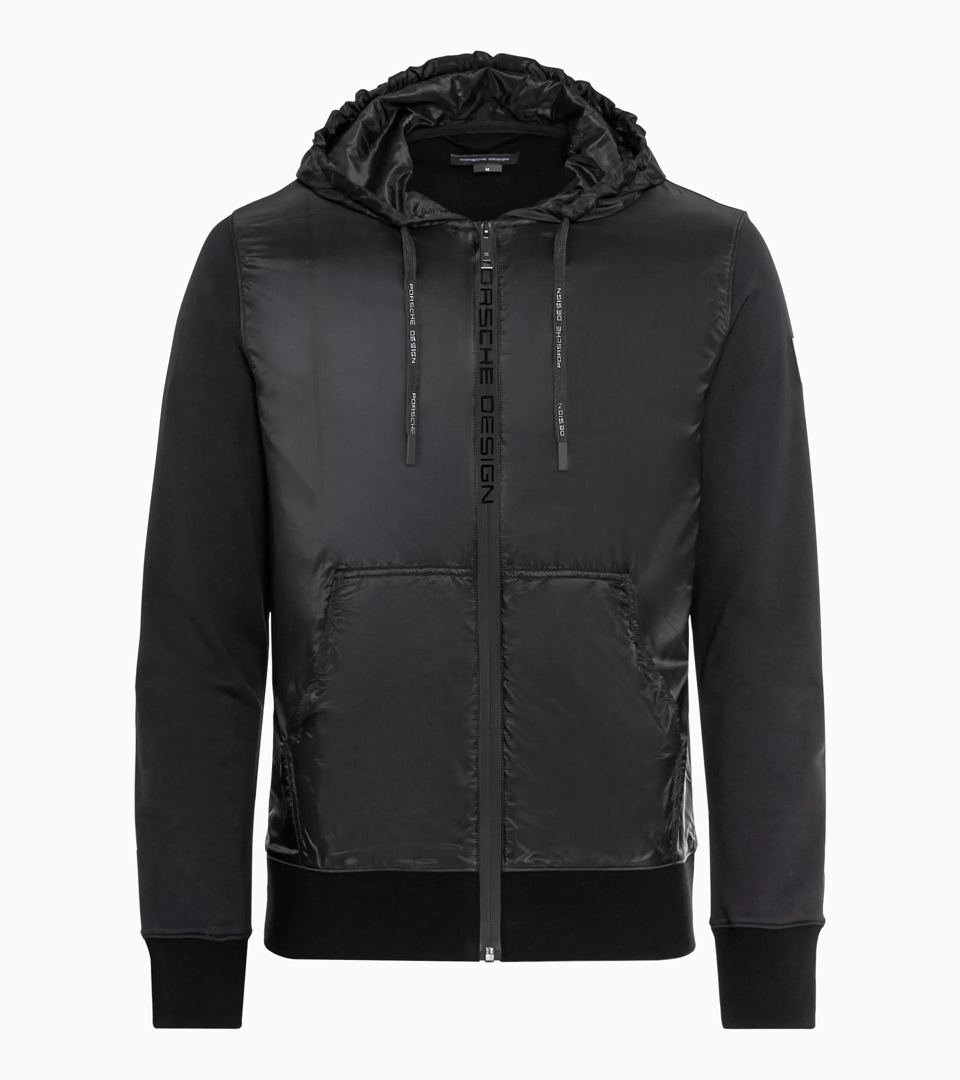 Il cardigan da uomo per ogni occasione: il Porsche Design Hybrid Cardigan. Il cardigan con cappuccio è estremamente dinamico grazie alla moderna combinazione di materiali – davanti, tasche a marsupio e cappuccio in nylon, retro, orlo e maniche in morbida maglia di cotone – ma è estremamente confortevole. Dopo la palestra, per incontrare gli amici, per una passeggiata per la città: la giacca ibrida, leggera e casual, è l'indumento giusto per ogni occasione. La cerniera antivento ispirata ai capi sportivi con logo Porsche Design lucido stampato, la patch con l'icona PC sulla parte superiore della manica e la coulisse personalizzata sul cappuccio sottolineano l'esclusività e la classicità della giacca. L'elevata qualità dei materiali è evidente non solo nell'estetica, ma anche ogni volta che si indossa la giacca.