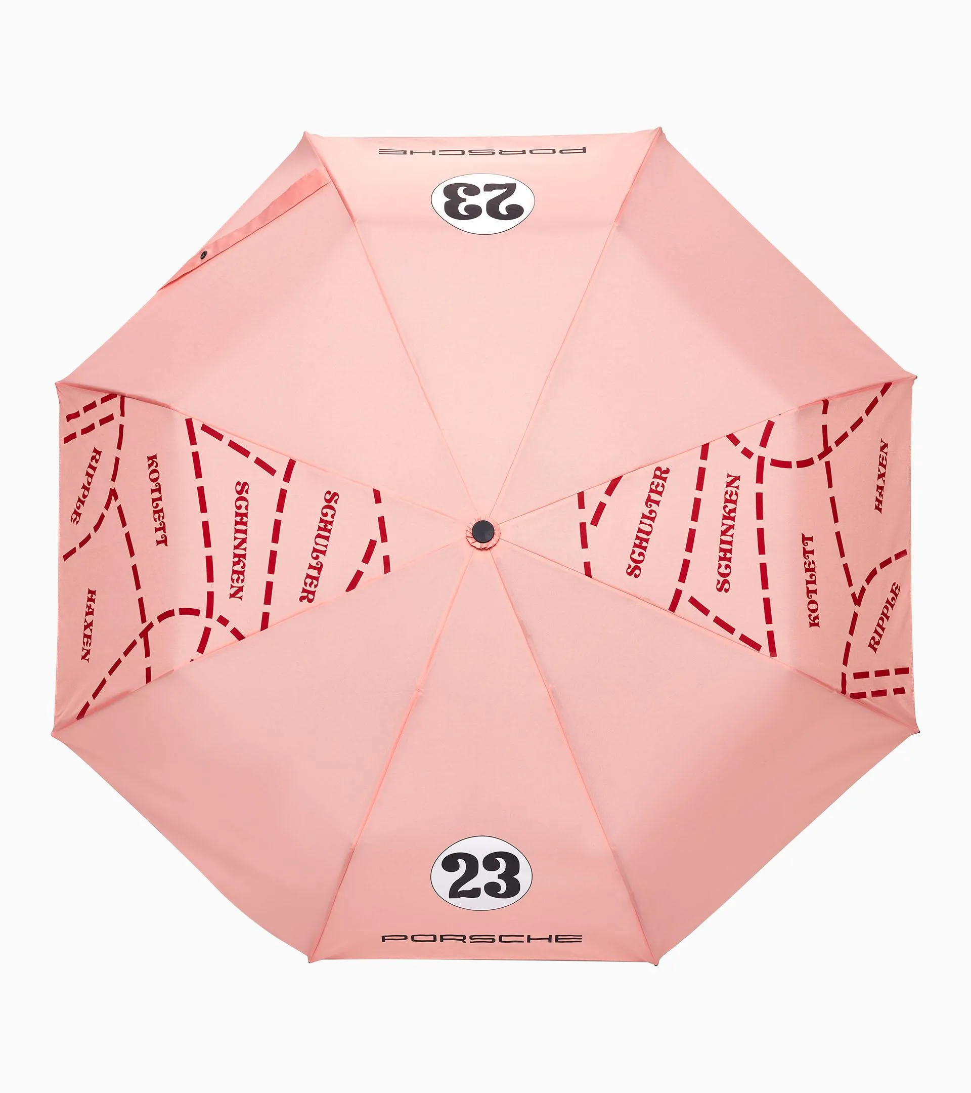 Ombrello pieghevole Porsche automatico e molto stabile con sistema antivento nel design della livrea 917 "maialino rosa".