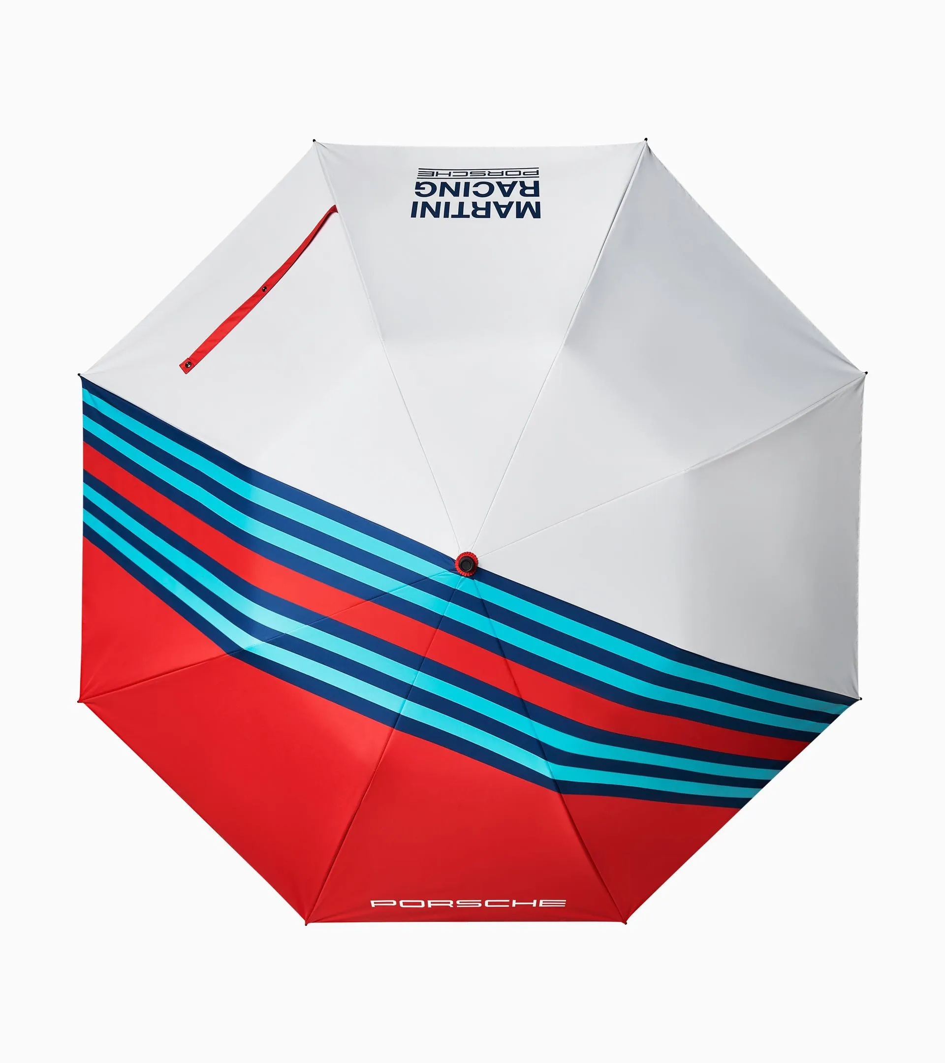 Parasole in formato da viaggio della Porsche Driver's Selection MARTINI RACING® Collection. Può essere utilizzato sia come parasole che come ombrello.